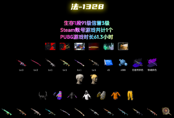 法-1328 91级 信誉等级3 无信号m4 3级 午夜98k 2级 赛博朋克mk12 深渊762 独角兽m24 猎手ace 异色无信号 异色午夜 黄东南亚 白战神 xdd手套 发光手臂 尼尔头套 恶魔角套 魔法少女套