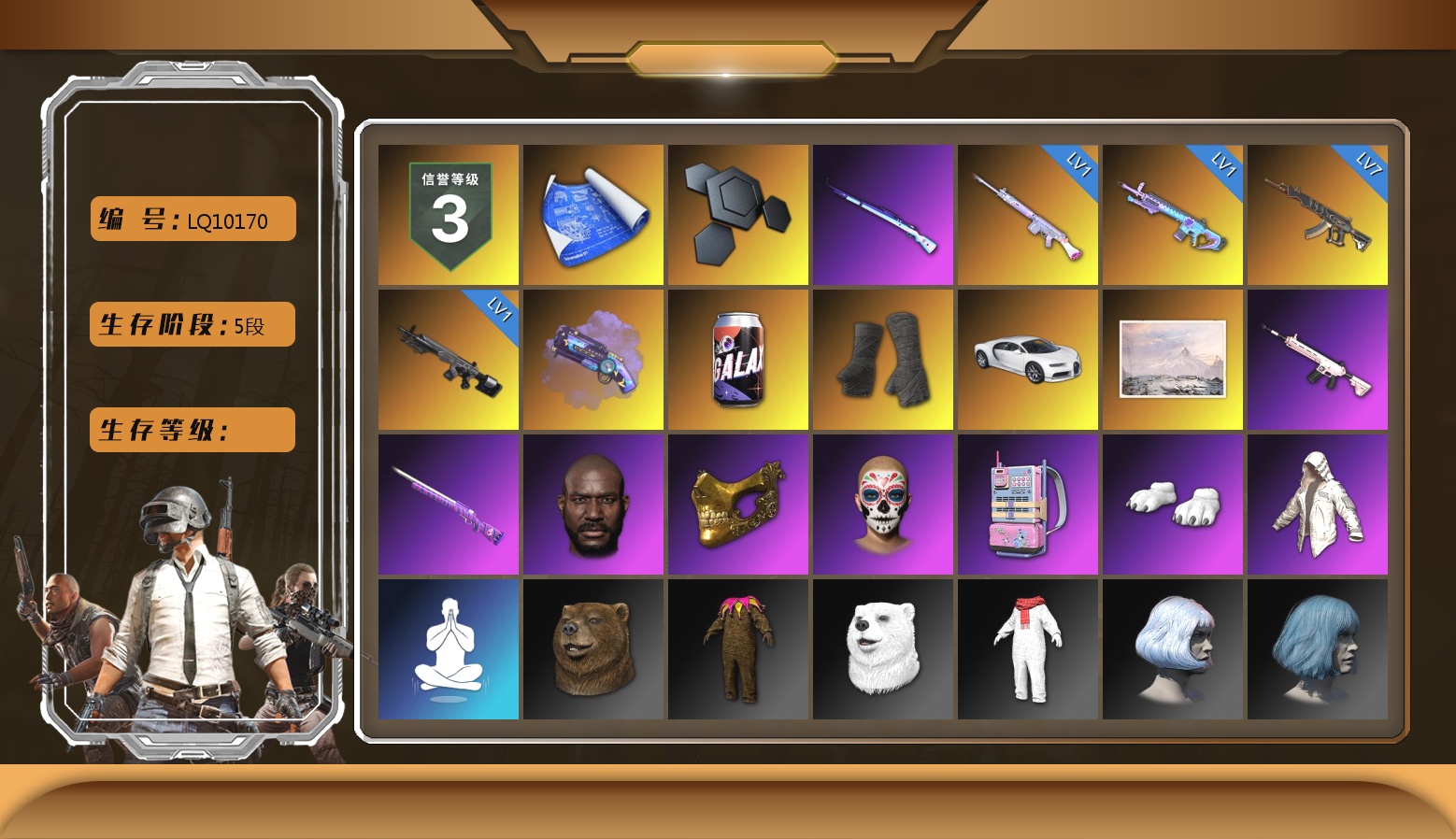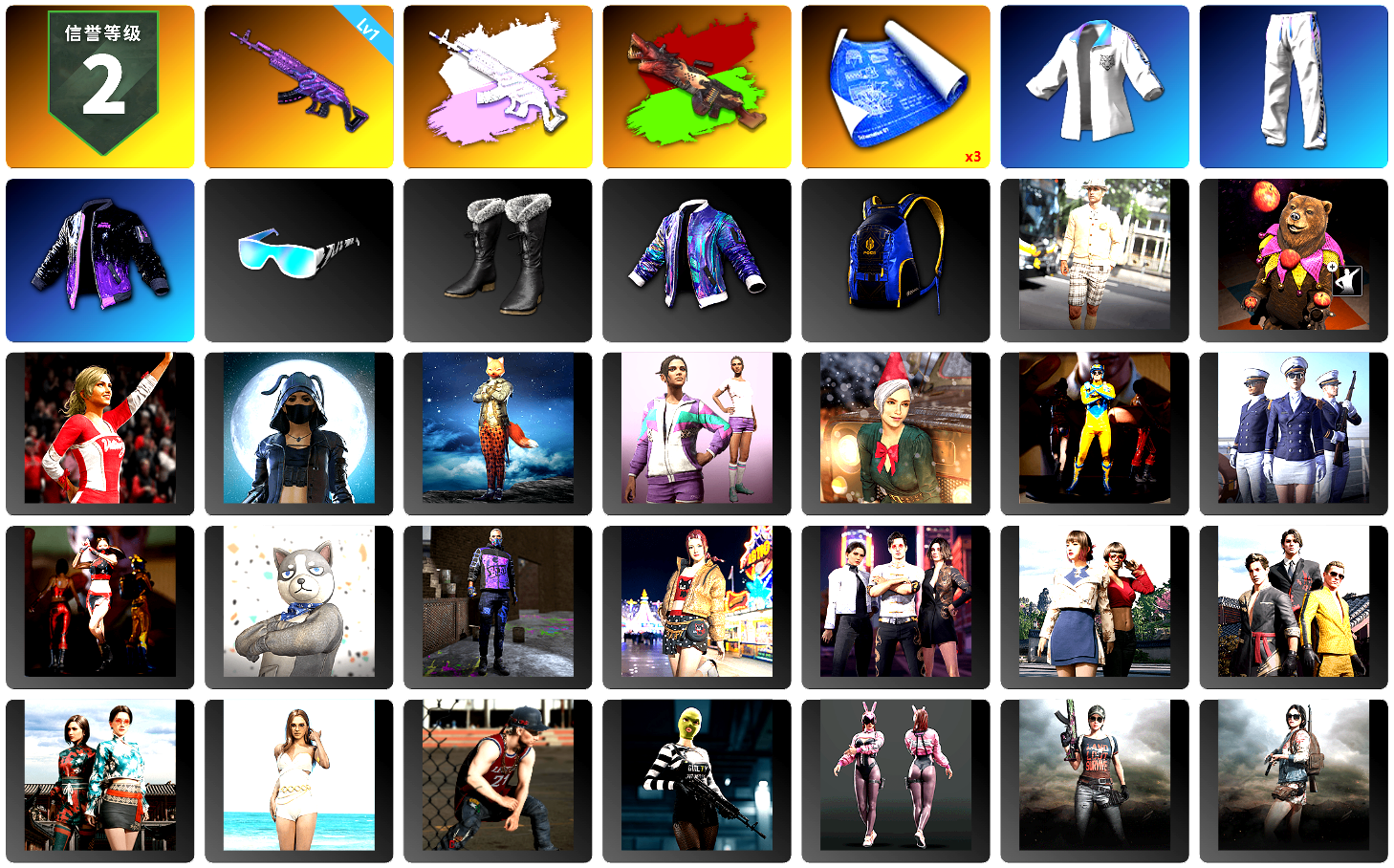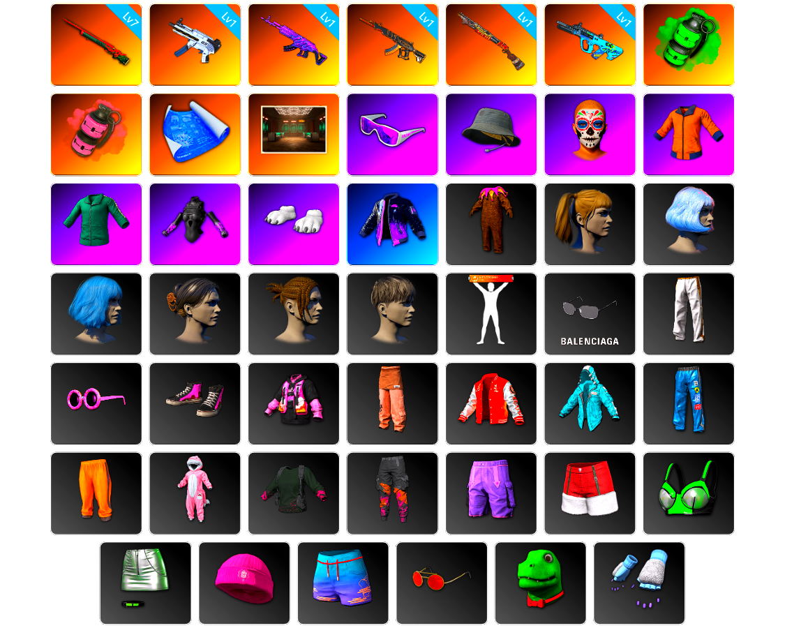 K裤 小丑女 小丑男 10级无信号M4 10级爆裂AUG 10级孙悟空M24 9级青龙762 9级圣诞mini 8级猛虎98k 6级圣诞AK 6级玄武SKS 5级猪八戒M4 3级唐三藏平底锅 2级恶魔ACE 2级彩虹M24 1级赛博MK12 1级霓虹AUG 1级时空使者M4 青龙762(异色) 猪八戒(粉异色) 无信号(紫异色) 孙悟空M24(异色) 圣诞AK(异色) 蓝色烟雾弹 橘色烟雾弹 珊瑚色烟雾弹 青色烟雾弹 橙色狂怒之雾-M79 黄色狂怒之雾-M79 蓝色魔法迷雾-M79 柏林鞋 黑绷带 白绷带 兰博基尼跑车 兰博基尼SUV 兰博基尼奢华版 迈凯伦硅质白版 杜卡迪暮光粉 兰博大厅 冬季藏匿处 交易所接待室 武器神龛 黑鬼 9s发型 滑雪镜 金面 渔夫帽 牛角 康萨斯 马东锡 橙色发带 红面巾 黑大衣 白战神 黄东 发光手臂 萨芬裤 白熊鞋 小叮当 粉战神 女团 阿狸 小黄鸭 可可 尼尔 车漆 小马尾 小绿头 丸子头 西游记 脏辫 青海摇 小兔学院 悲喜 绷带AK 滑雪帽 PGC 2021套装 胜利之舞39 枪炮洗礼