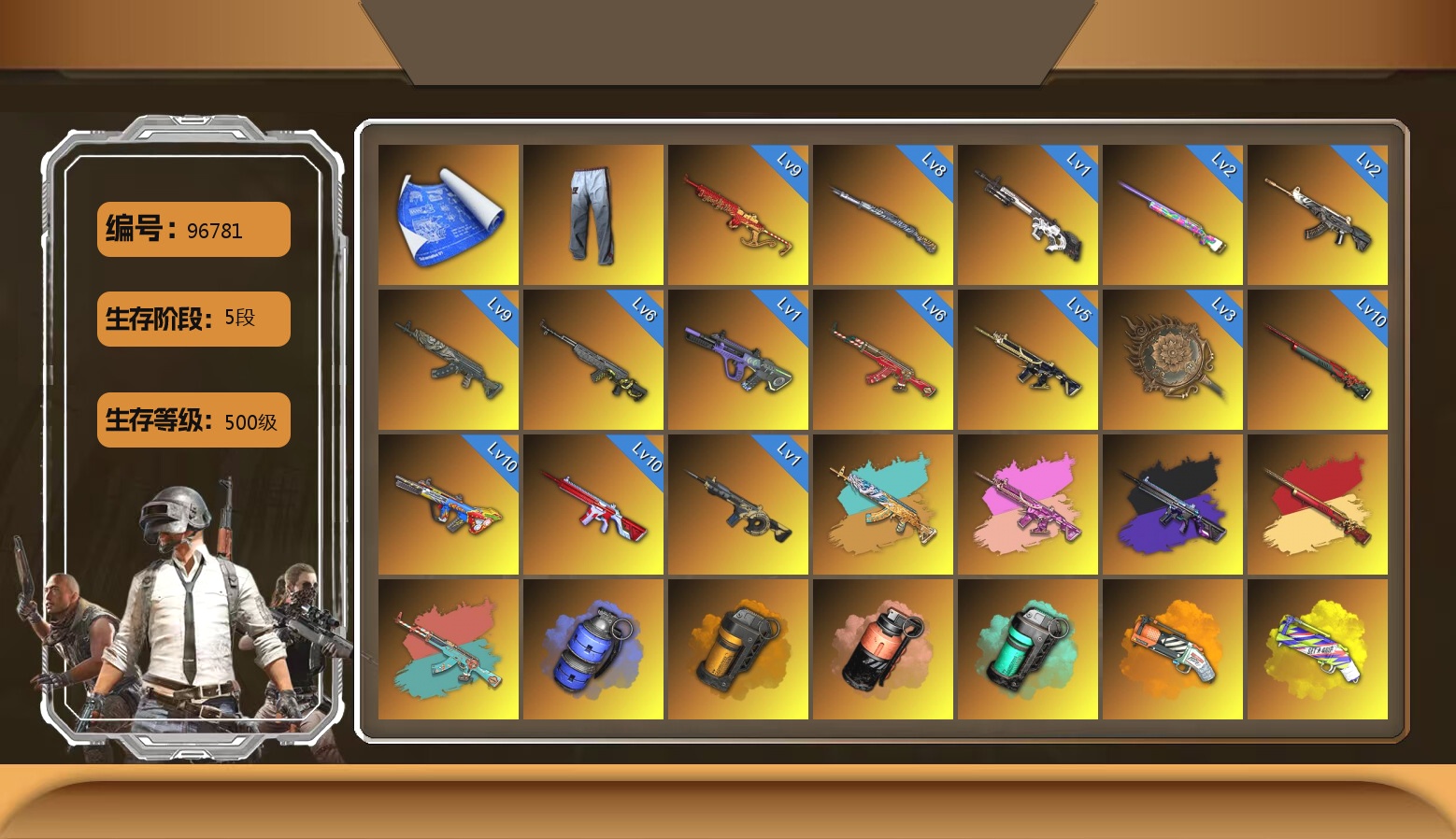7级妖魔之触ACE 1级玩偶炮 1级魔咒之力Mk12 1级暗影之主Mk12 紫色魔法迷雾-M79 黑绷带 布加迪跑车 冬季藏匿处 6张图纸 7698聚合物 粉猪M4 少女98k 黑鬼 金面 电磁背包 白熊鞋 拉风龙 脏辫 小兔学院 胜利之舞39