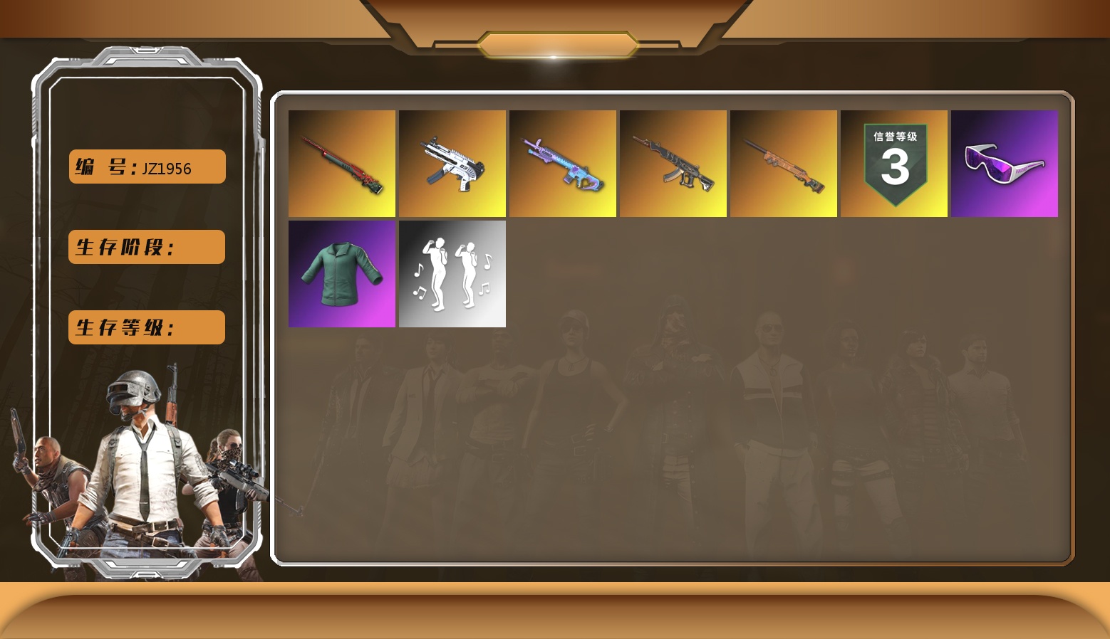 9级青龙762 8级朱雀M4 4级水麒麟 4级恶魔ACE 3级彩虹M24 紫色烟雾弹 小黑盒 迈凯伦硅质白版 5712聚合物 滑雪镜 金面 发光手臂 小黄鸭 车漆 小马尾 小绿头 丸子头 脏辫 悲喜 枪炮洗礼