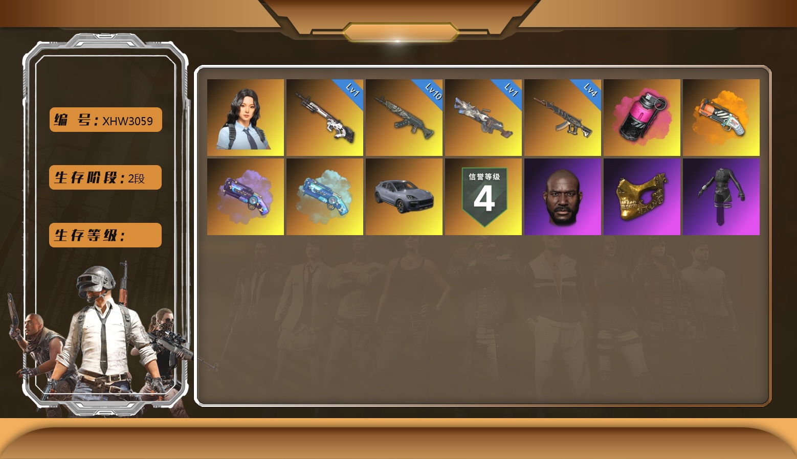 XHW3059 二阶段 信誉四级 【保时捷卡宴】 10-4-1-1-1 10级青龙 4级妖魔 1级赛博 1级M249 1级汉娜 黑鬼 金面 红烟 女团吉赛尔 3张图纸 星魂白运动 白熊脚 未升级plus