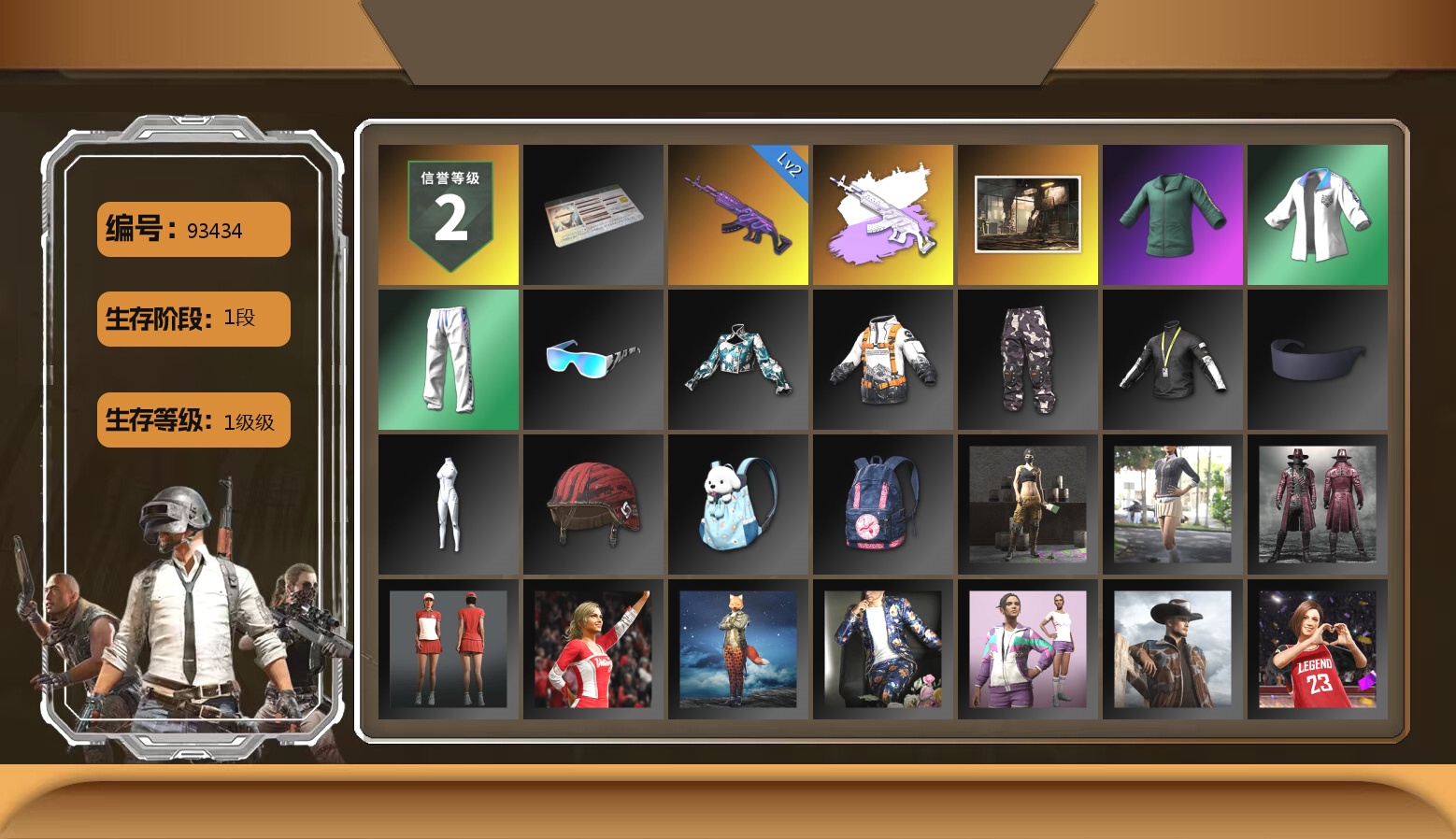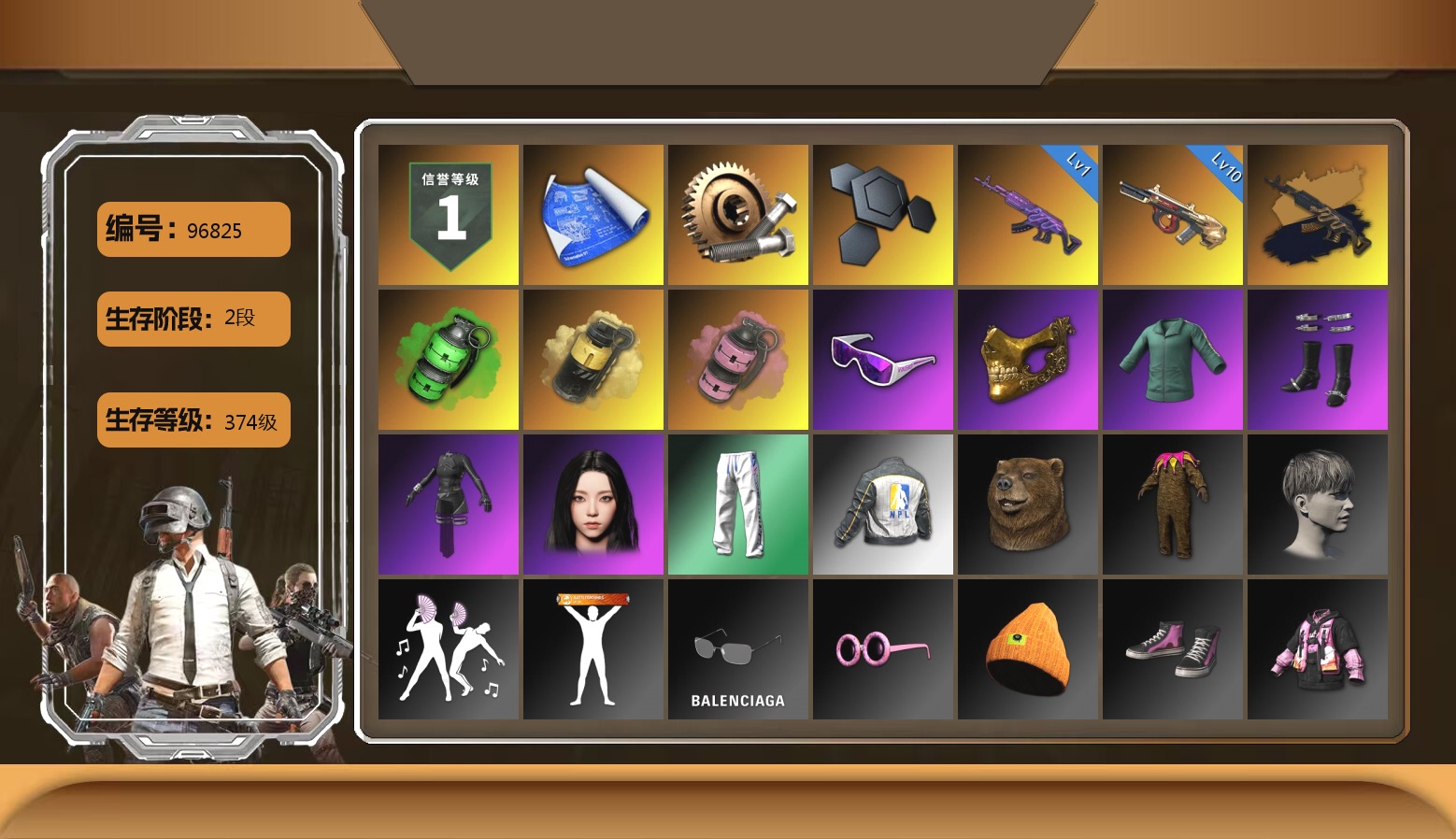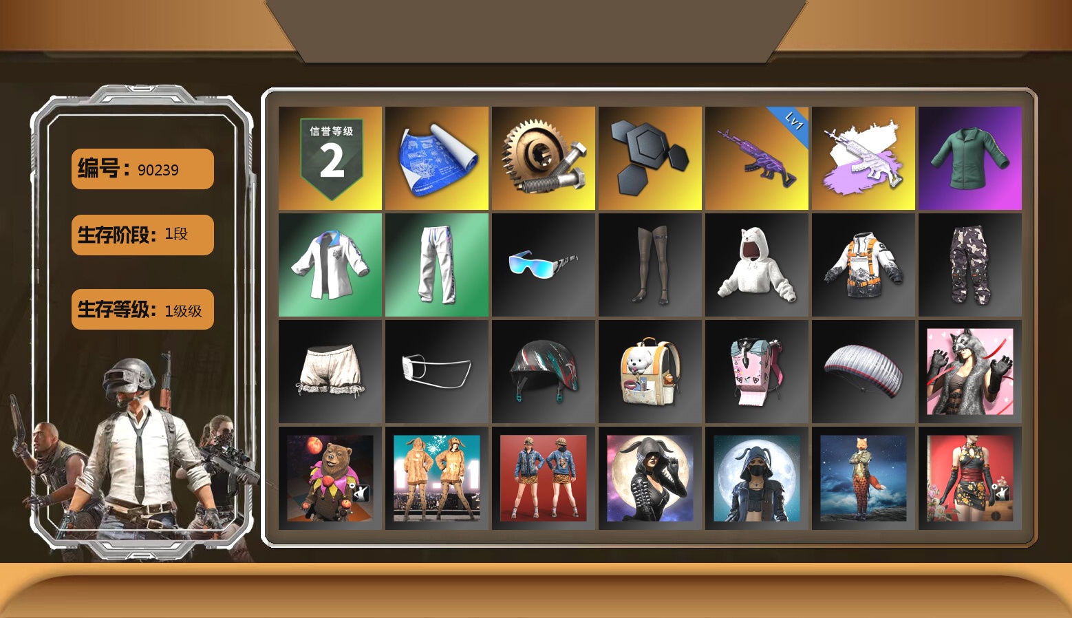 6级孙悟空M24 3级齿轮炮 2级恶魔ACE 1级水麒麟 1级爆裂AUG 1级无信号M4 1级午夜惊魂98K 1级烈日灼烧-S1897 青色烟雾弹 柏林鞋 黑绷带 兰博基尼SUV 冬季藏匿处 交易所接待室 7755聚合物 黑鬼 9s发型 滑雪镜 金面 牛角 红面巾 黑大衣 白战神 发光手臂 白熊鞋 粉战神 尼尔 拉风龙 小马尾 丸子头 西游记 青海摇 小兔学院 悲喜