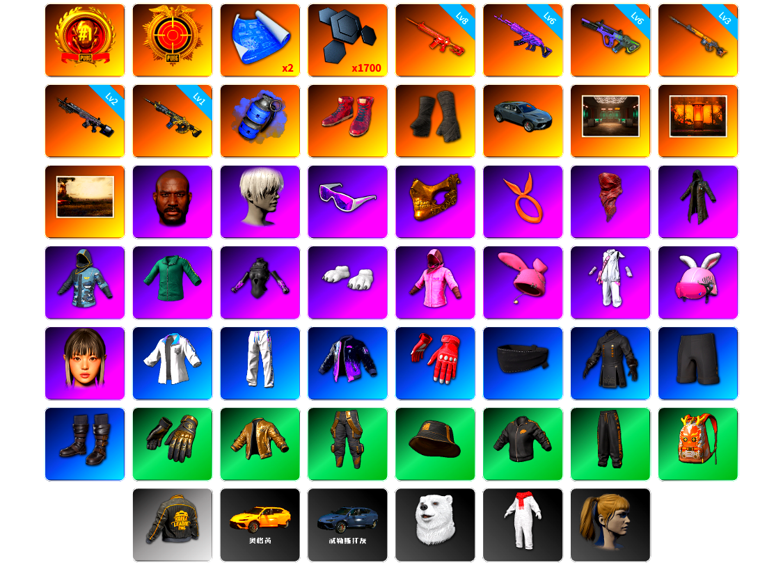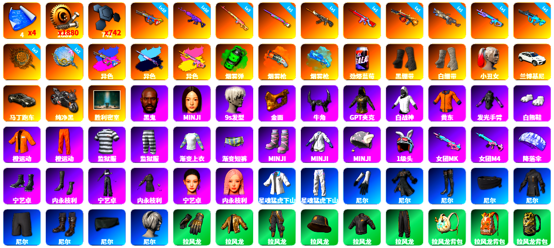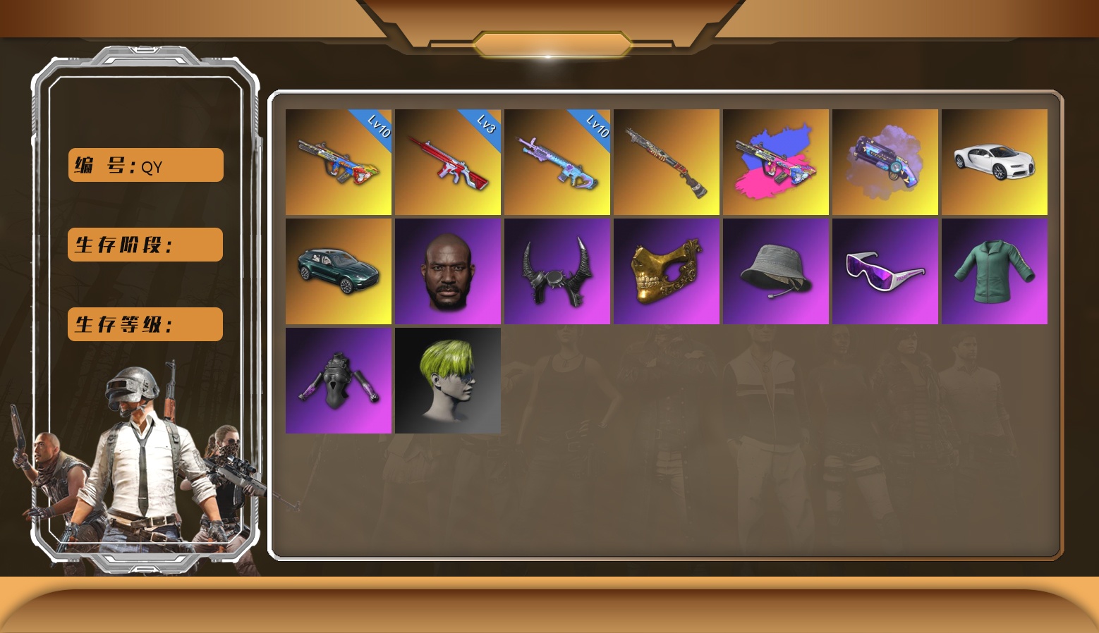 双头黑鬼金面 满级火麒麟 6级aug 5级sks 4级青龙 3级炫彩m24 2级ace 2级白虎锅 1级南瓜 1级无信号 1级朱雀 1级猪八戒 1级爆珠aug 1级齿轮slr 1级玩偶slr 1级孙悟空 1级ak 1级mini 1级dbs 1级唐三藏 1级新98k 异色孙悟空 mini aug mp5k
