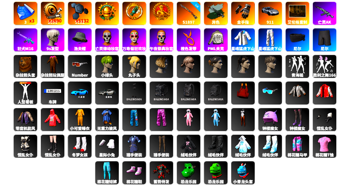 ❤找回包赔❤编号J32012皮肤:3张图纸 蜗牛币 5200聚合物 猎手金 这是属于我的距离金 震惊金 6级烈日灼烧-S1897 时空使者M4(异色) 金手指 保时捷911 亡灵AK 狂犬M16 9s发型 渔夫帽 亡灵律动妆容 万寿菊狂欢妆容 午夜祭典妆容 橙色发带 发光手臂 白熊鞋 星魂猛虎下山运动夹克 星魂猛虎下山运动裤 尼尔 杂技熊头套 杂技熊玩偶服 Number 小绿头 青海摇 巴黎世家比基尼 巴黎世家背包(3级) 巴黎世家背包(2级) 巴黎世家背包(1级) 卡通学院夹克 零度机能风 3周年纪念连帽卫衣 紫色运动裤 粉鲨宝宝连身睡衣 蓝鲨宝宝连身睡衣 恐龙乐园 恐龙乐园 宝贝外面冷 兄弟同盟 白虎夹克 薄荷巧克力 头号主播 OGBG 纹身 萨莉的礼服 萨莉的皮鞋 萨莉2级头 小兔学院 发型60 万圣节大奖 复古兜风 2级头 三级头 内马尔JR - 头盔(3级) 波普风 - 头盔(3级) 汪汪伙伴背包(2级) 2级包 南瓜RIP降落伞 赛季19竞技降落伞 赛季7竞技降落伞 银兔猎手降落伞 3周年纪念降落伞 赛季37竞技降落伞 夜伴花开套装 粗糙 (橙色) - M416 3周年纪念 - M416 镀银 - M416 赤红雪花 - M416 数码沙漠迷彩 - M416 鎏金王朝 - Beryl M762 镀银 - Beryl M762 [战场痕迹] 逆潮 - Beryl M762 蟒蛇花园 - AKM 灵魂枷锁 - AKM 焰弹召唤者 - AKM 极速 - AKM 粗糙 (橙色) - AKM 镀银 - AUG 金色续响 - AUG 远程地图 - AUG 月之尘 - AUG 第一年纪念 - SCAR-L 数码雪地迷彩 - SCAR-L 粗糙 (橙色) - SCAR-L 三重彩 - SCAR-L 圆点猎手 - M16A4 分形几何 - QBZ 灰色系 - Mk47 Mutant 分形碎片 - Mk47 Mutant 灵魂枷锁 - Mk47 Mutant 风化野马 - G36C 方形铬印 - Groza 风化野马 - Groza 镀金 - Groza 无慈悲 - K2 水手 - K2 毒弹召唤者 - SLR 六边形战士 - SLR 水手 - SLR [战场痕迹] 猛虎猎手 - SLR Swagger 的SLR 礼品店 - SKS 极速 - SKS 镀金 - SKS 赛季31竞技黄金 - Mk14 眼镜蛇 - Mk14 爬行者之印 - VSS 海洋哑光(蓝色) - VSS 冰弹召唤者 - VSS 毒性 - VSS 霜寒 - VSS 百搭牌 - QBU 潮汐地图 - QBU 魔力甜心萨莉的永恒挚友 - 德拉贡诺夫 余音环绕 - UMP 镀金 - Win94 [战场痕迹] 金色落叶 - Kar98k 粗糙 (橙色) - Kar98k [战场痕迹] 红网 - AWM 镀金 - AWM 巨蟒 - M24 王牌 - 莫辛纳甘步枪 圆点猎手 - 莫辛纳甘步枪 灰色系 - MP5K 标准猎手 - MP5K 竞速之道 - P90 蟒蛇 - PP-19 Bizon 镀金 - UMP 行动时刻 - UMP 狂犬 - UMP 镀银 - UMP 雪国风光 - 汤姆逊冲锋枪 风化野马 - 汤姆逊冲锋枪 数码雪地迷彩 - 汤姆逊冲锋枪 镀银 - 汤姆逊冲锋枪 焰弹召唤者 - 蝎式手枪 银河武装 - MP9 精制风神 - Vector 淡雅之力 - Micro UZI 六边形战士 - Micro UZI 风化野马 - M249 三重条纹 - DP-28 冰弹召唤者 - DP-28 海藻自己上 - O12 狂犬 - S12K 无尽迷宫 - S12K 优雅 - S12K 蝰蛇 - S1897 毒性 - S1897 礼品店 - S686 灰色系 - S686 粗糙 (米色) - S686 极速 - P92 三重彩 - P92 沙漠烈阳 - 沙漠之鹰 三重条纹 - 沙漠之鹰 霜寒 - R1895 古老地图 - R45 百搭牌 - R45 铜头蛇 - P1911 赤红雪花 - P18C 优雅 - P18C 锯齿大砍刀 消防斧 退色的撬棍 淡雅之力 - 镰刀 马桶塞 海洋地图 - 十字弩 百步穿杨 - 平底锅 历久弥新 - 平底锅 切割狂潮 - 平底锅 小兔学院水手服手套 针织工作手套 战术手套 队长的迷彩手套 缝制皮革手套 (深灰) 战场老兵手套 丑陋的节日手套 准备就绪手套 战斗手套 (卡其色) 6周年纪念露指手套 露指操作员手套 PGC 2019 护手和智能手表 卡通学院眼镜 角质架眼镜 (黑色) 女明星眼镜(白色) 书虫眼镜(粉红色) 书虫眼镜(棕色) 复古眼镜 死亡六进制太阳镜 带色摩托眼镜 PGC 2019 眼镜 部落脸部刺青 2 丛林面部迷彩 PCS7 冠军妆容 女性面容9 女性面容8 雪地面部迷彩 女性面容7 男性面容7 午餐肉 邓肯·斯莱德 男性面容10 男性面容9 男性面容12 男性面容8 发型11 发型12 发型13 治安队发型 发型33 发型20 发型17 发型10 黑色铆钉背包(3级) 寒锋背包(3级) 游击背包(3级) 橄榄绿铆钉背包(3级) 迷彩军事背包(3级) 恐龙地带背包(3级) 米拉玛地图背包(2级) 无处可躲背包(2级) 皮革背包(2级) 棕色旅行包(2级) 青铜神枪手背包(1级) 神枪手背包(1级) 红眼神枪手背包(1级) 柯基帮头盔(3级) 星之碎片 - 头盔(2级) 死亡六进制 - 头盔(2级) 军用防弹头盔(2级) 幸运之翼头盔(2级) 军用皮革 - 头盔(2级) 军医 - 头盔(2级) 闪电 - 头盔(2级) 黑蜘蛛 - 头盔 (1级) 闪电赛车手 - 头盔(1级) 皮革赛车手 - 头盔(1级) 黑色火焰赛车手 - 头盔(1级) 复古赛车手 - 头盔(1级) 狂乱深渊 - 头盔(1级) LOS摩托车 - 头盔(1级) 扫雷 - 头盔(1级) 恐龙乐园 “卡蜜” 面具 圣诞毛毛球针织帽 86冒险家渔夫帽 传统韩服纱帽 费多拉帽 2周年纪念帽 PGI 帽子 褐湾鸭舌帽(灰色) 羊毛护耳帽(黑色) 磨损的帽子 复古棒球帽 (白色) 队长的迷彩鸭舌帽 铁娘子鸭舌帽配护目镜 巡逻帽 (棕色) 皮革检察官帽子 冰霜公主针织帽 俄式毛皮帽(黑色) 稻草帽 丑陋的节日帽子 复古棒球帽 (红色/白色) 蓝色头巾 黑色绒线帽和耳机 紫边棒球帽 狮王面具 PGC 2019 头饰 红鼻子 治安队面具 准备就绪口罩 犬牙织纹面具(棕黄色) 黑蜘蛛面具 犬牙织纹面具(象牙色) 车手面具(黑色) 圣柱军团战术面罩 骸骨面具 骷髅摩托面具 卡通学院面具 睡眠眼罩 队长的迷彩面巾 防毒面具(军用) 口罩 检察官防毒面具 烤鸡节围巾 羊毛围巾(棕色) 沙暴伪装丝巾 内马尔JR的T恤 维寒迪飞行夹克 轰炸机夹克(灰色) 太极 游击皮夹克 蟒蛇花园夹克 86冒险家夹克 花卉印花轰炸机夹克 准备就绪夹克 红魔夹克 午餐肉的连帽卫衣 猩红猎手夹克 我的闪耀