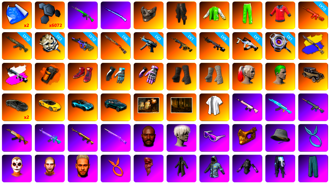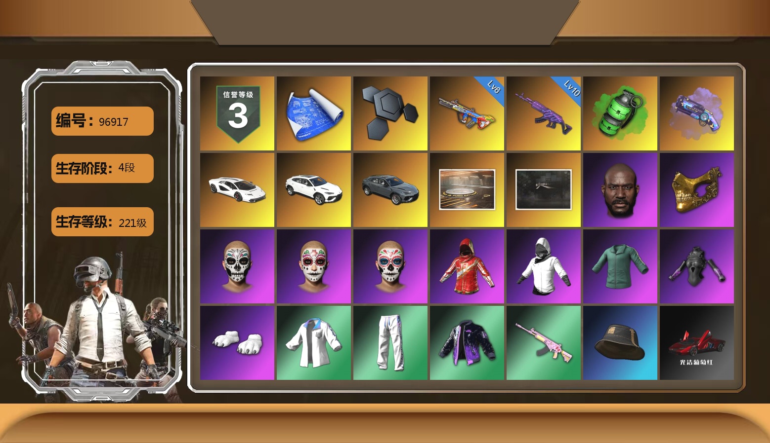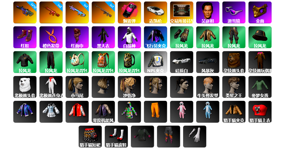 6级圣诞AK 2级弥诺陶洛斯AUG 1级玩偶炮 1级孙悟空M24 1级午夜惊魂98K 1级妖魔之触ACE 翡翠色烟雾弹 柏林鞋 黑绷带 冬季藏匿处 交易所接待室 18524聚合物 黑鬼 金面 红面巾 黑大衣 发光手臂 电磁背包 白熊鞋 粉战神 拉风龙 小马尾 脏辫 青海摇 小兔学院 悲喜 西游记