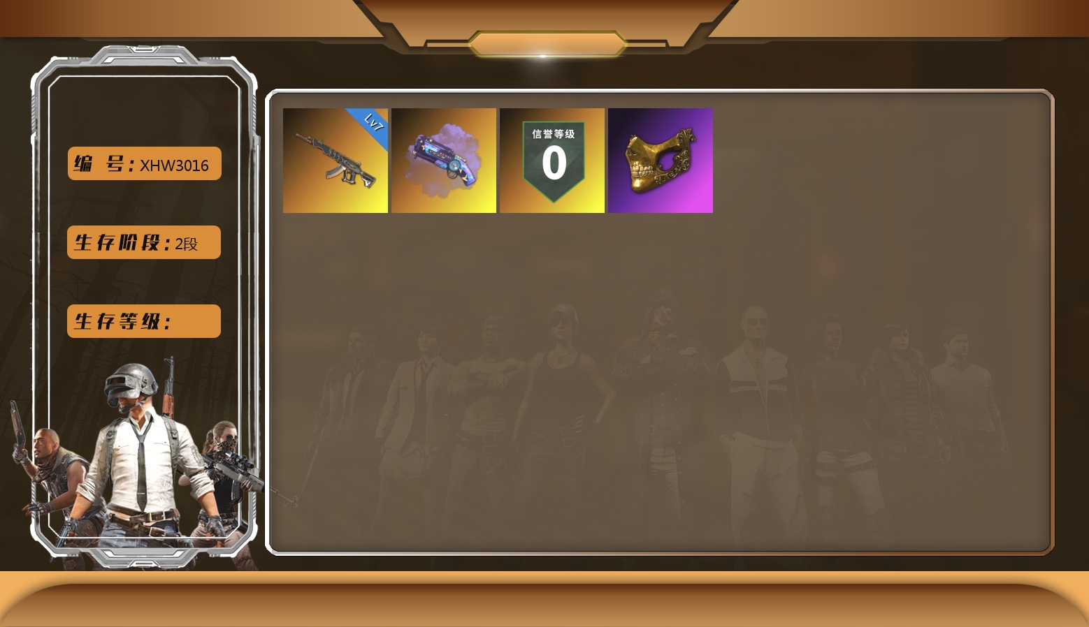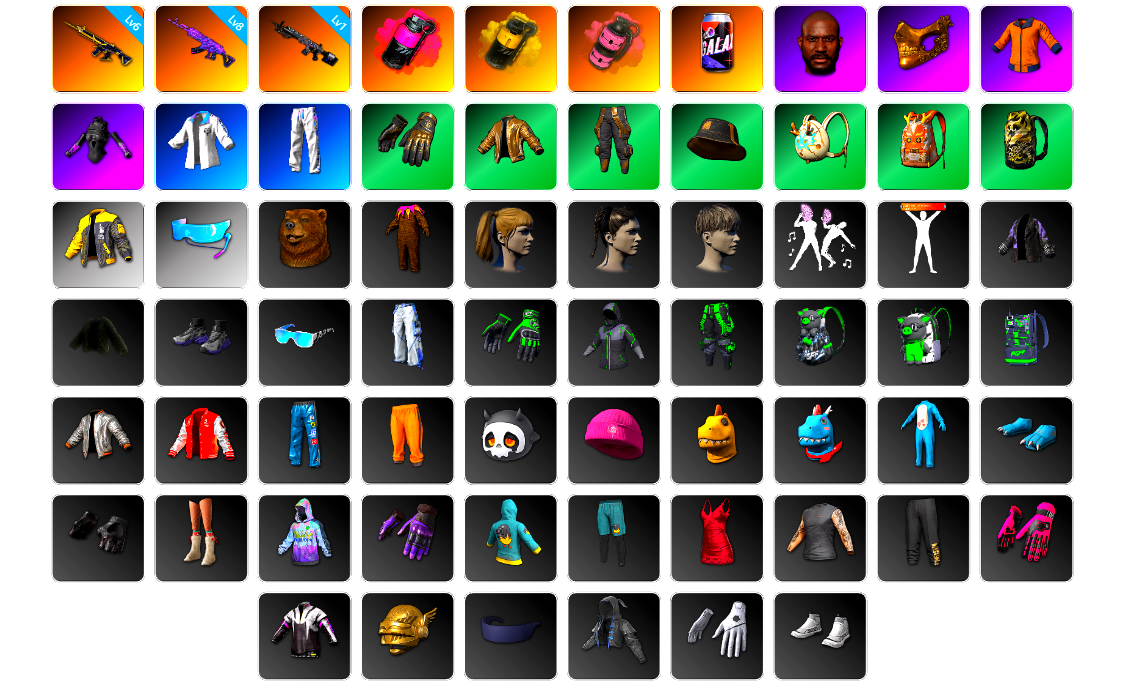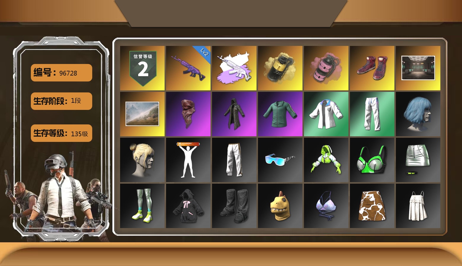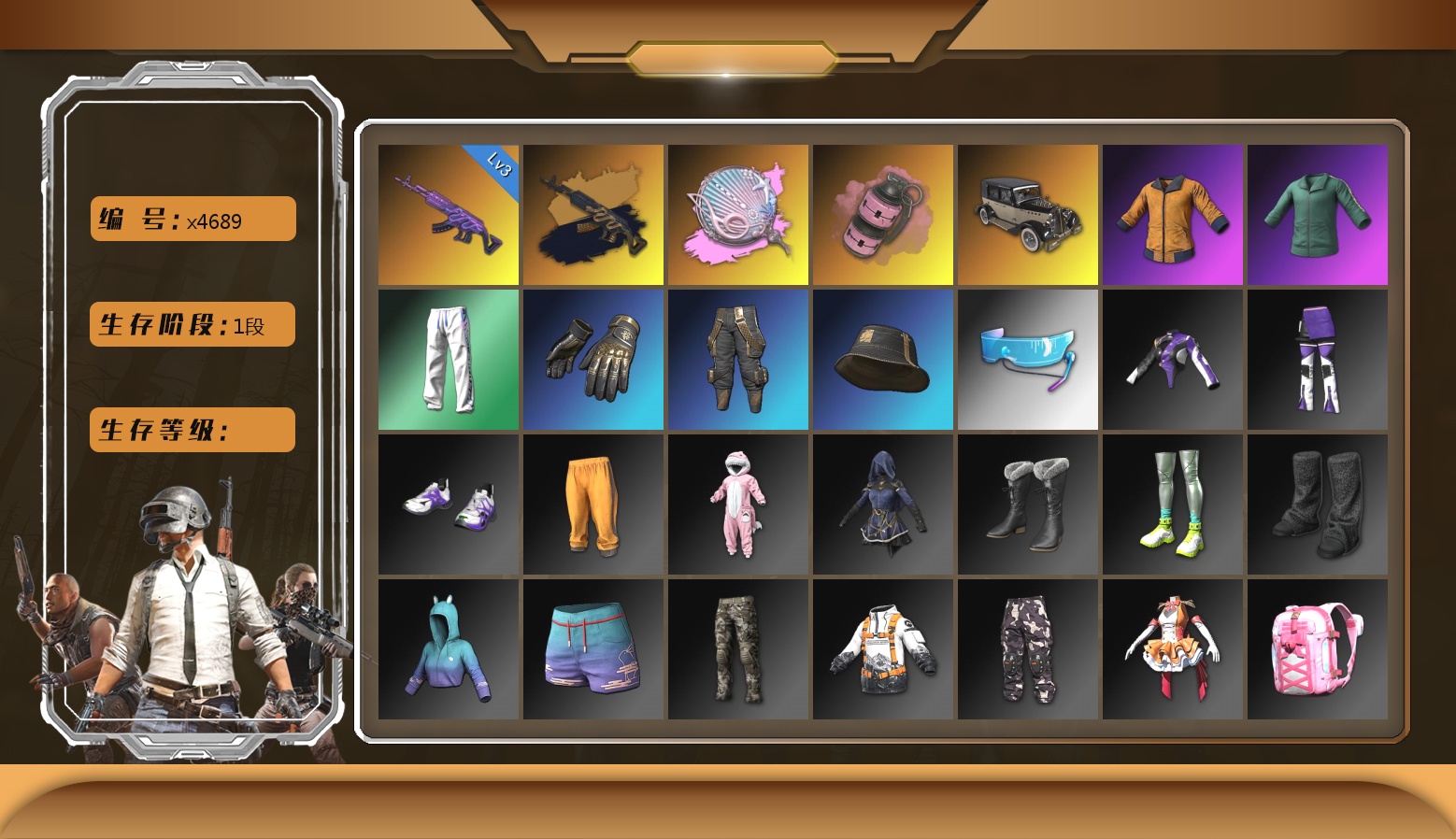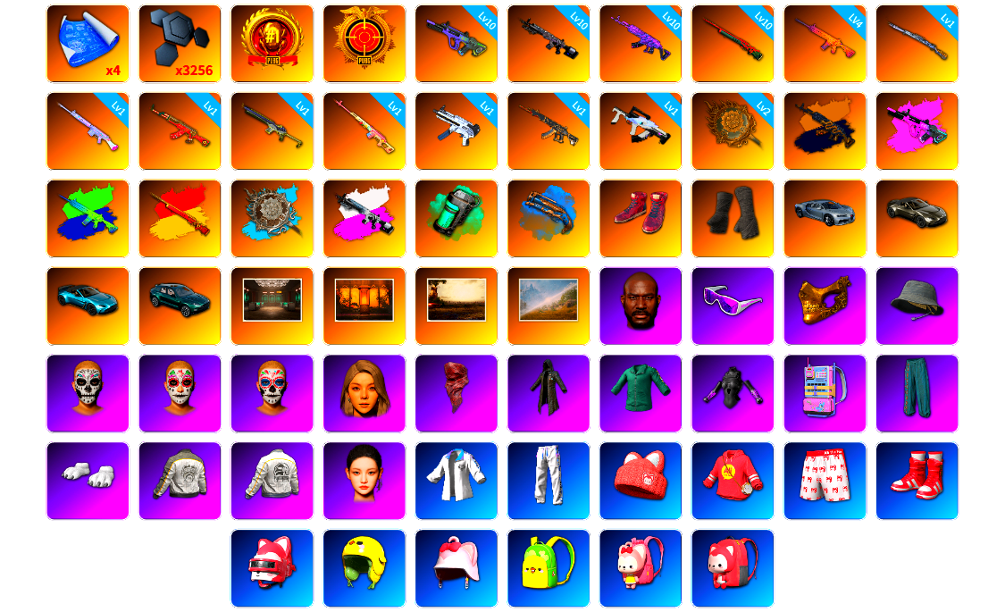 4张图纸 3256聚合物 10级霓虹AUG 10级暗影之主Mk12 10级美杜莎762 10级孙悟空M24 4级南瓜M4 1级猛虎98k 1级玩偶炮 1级圣诞AK 1级沙悟净MINI 1级德拉贡 1级无重力MP5K 1级妖魔之触ACE 1级冰域Groza 2级唐三藏平底锅 美杜莎(黑异色) 霓虹AUG(异色) 南瓜M4(异色) 孙悟空M24(异色) 唐三藏(异色) 暗影之主Mk12(异色) 青色烟雾弹 湛蓝狂怒之雾-M79 柏林鞋 黑绷带 布加迪奢华版跑车 马丁跑车 马丁敞篷跑车 马丁SUV 交易所接待室 武器神龛 黑鬼 滑雪镜 金面 渔夫帽 红面巾 黑大衣 活动绿东 发光手臂 电磁背包 萨芬裤 白熊鞋 阿狸 鸡斯卡夹克 (奢华版)科米特绿 车漆 小马尾 丸子头 西游记 脏辫 青海摇 小兔学院
