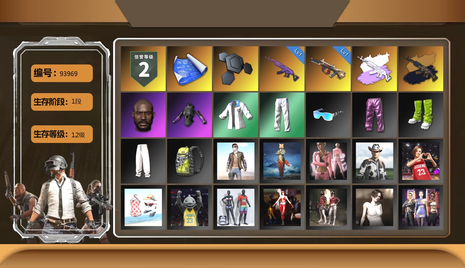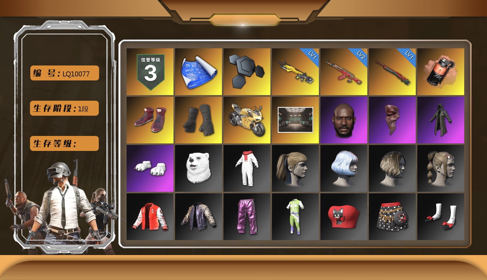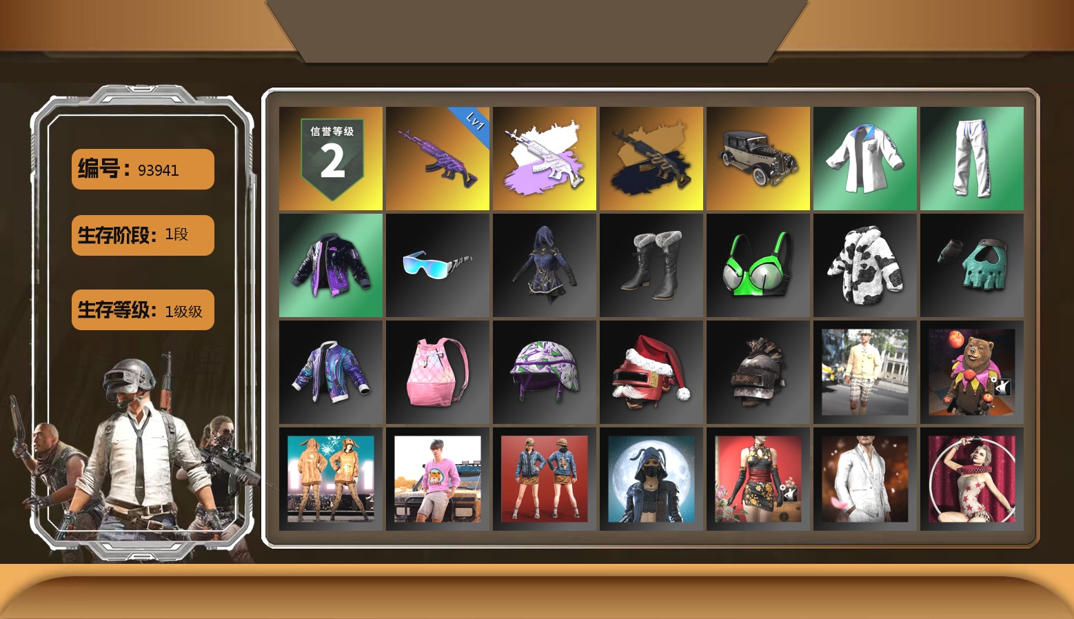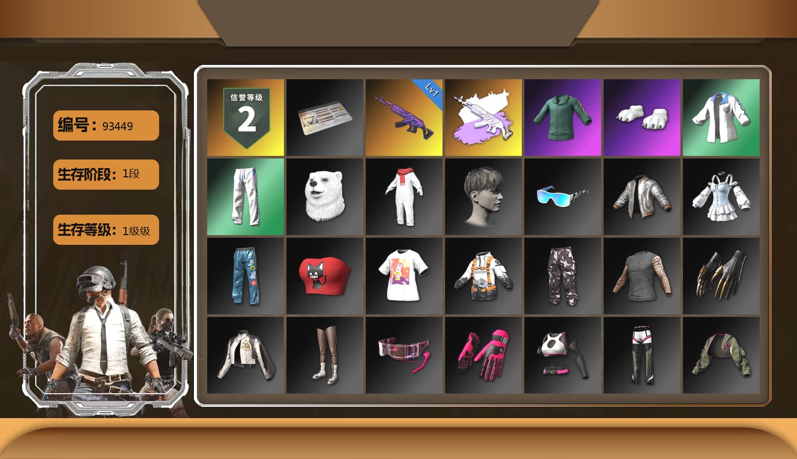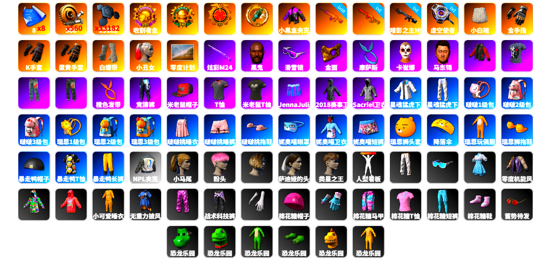 2级圣诞AK 1级小兔MK12 1级孙悟空M24 珊瑚色烟雾弹 柏林鞋 黑绷带 杜卡迪极速金 交易所接待室 3张图纸 9574聚合物 黑鬼 红面巾 黑大衣 白熊鞋 小马尾 小兔学院 西游记