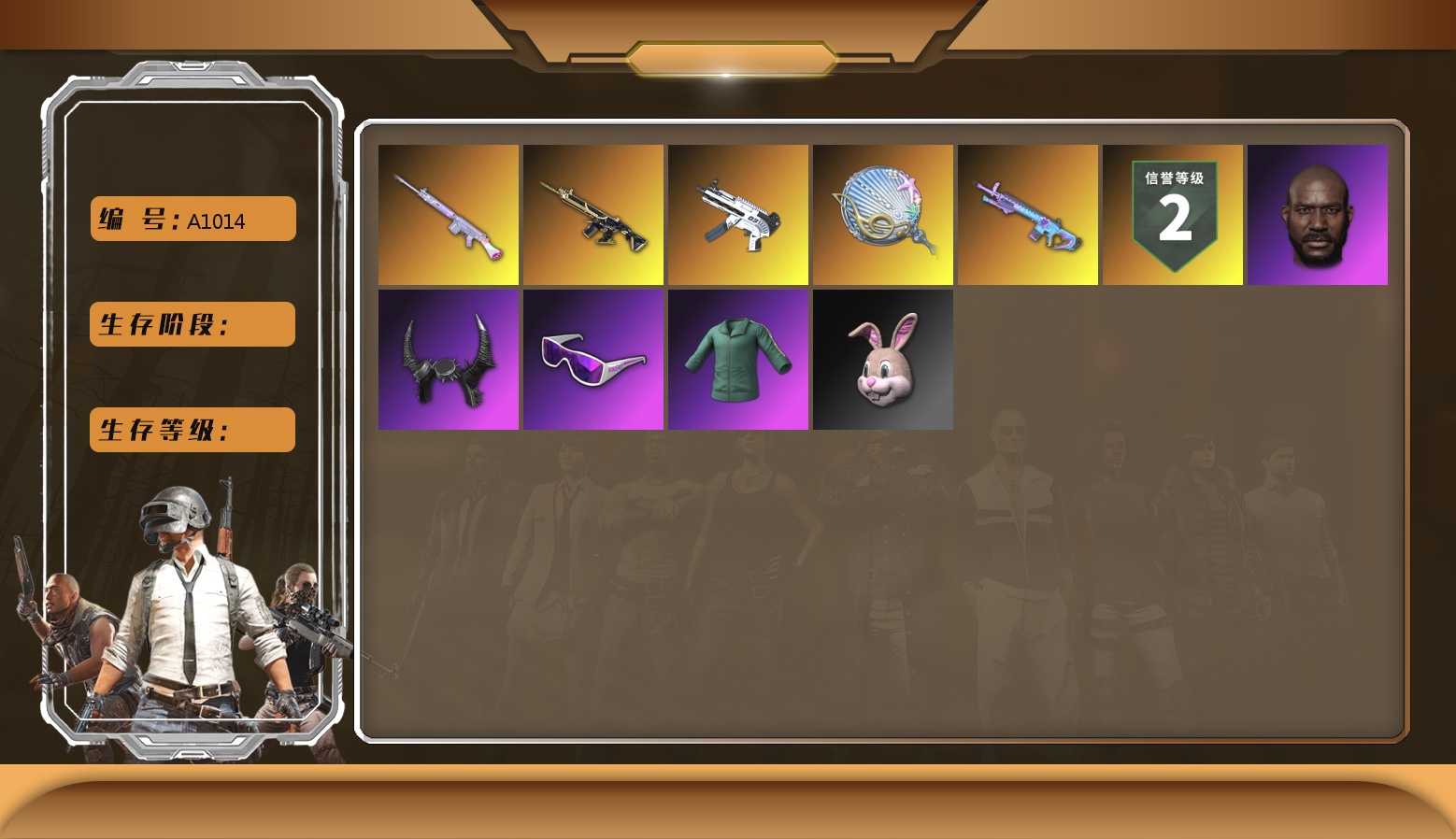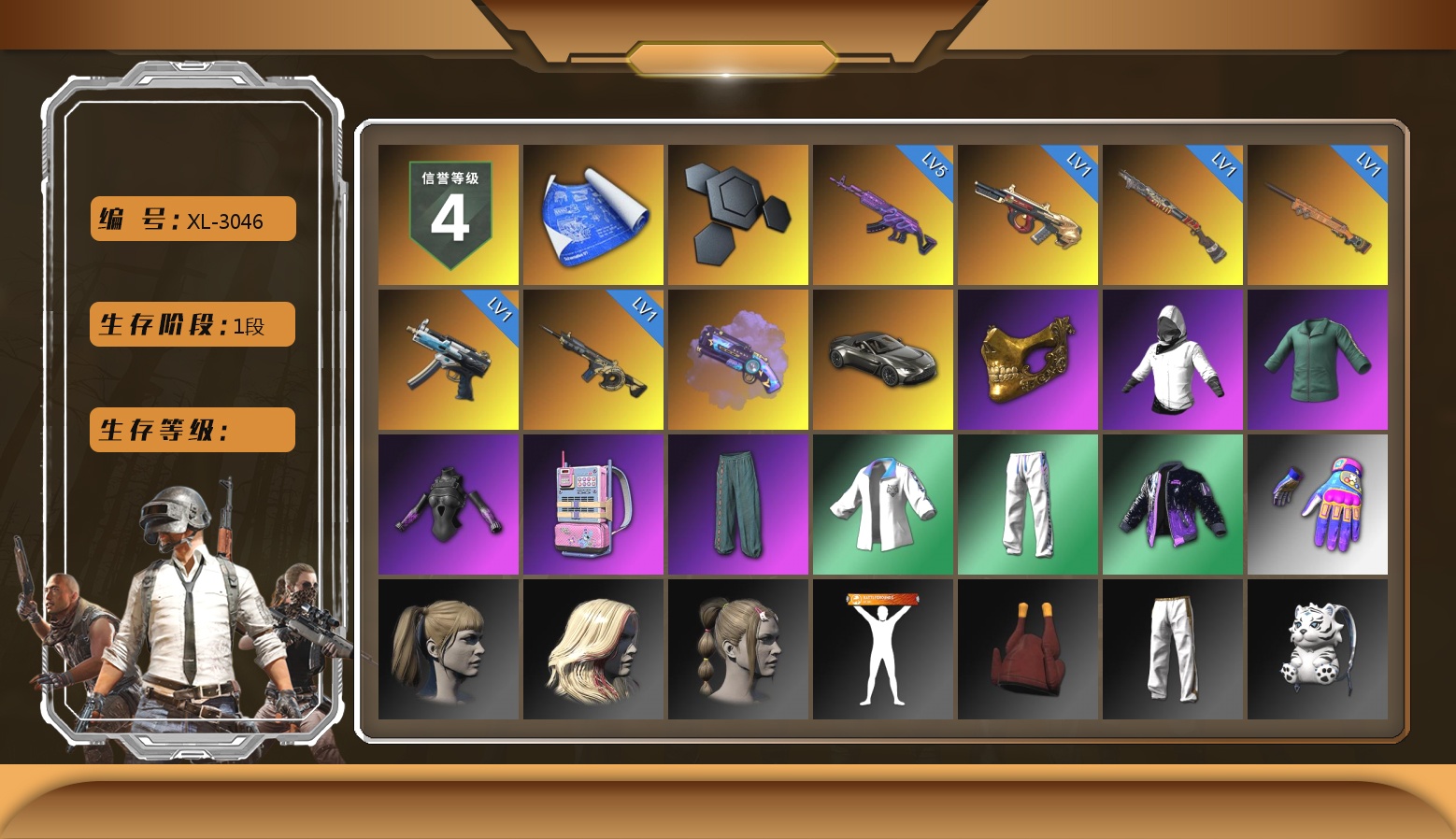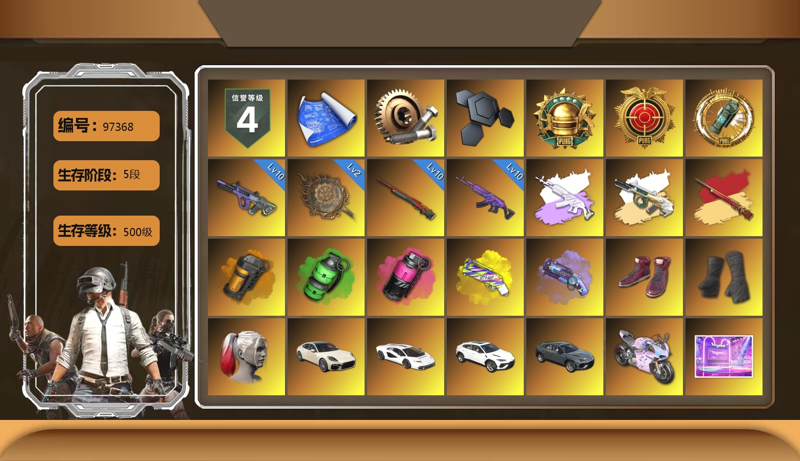 5级美杜莎762 1级弥诺陶洛斯AUG 1级烈日灼烧-S1897 1级夜曲M24 1级寒蚀MP5K 1级时空使者M4 紫色魔法迷雾-M79 马丁跑车 1张图纸 2372聚合物 金面 白战神 活动绿东 发光手臂 电磁背包 萨芬裤 小马尾 小兔学院 西游记