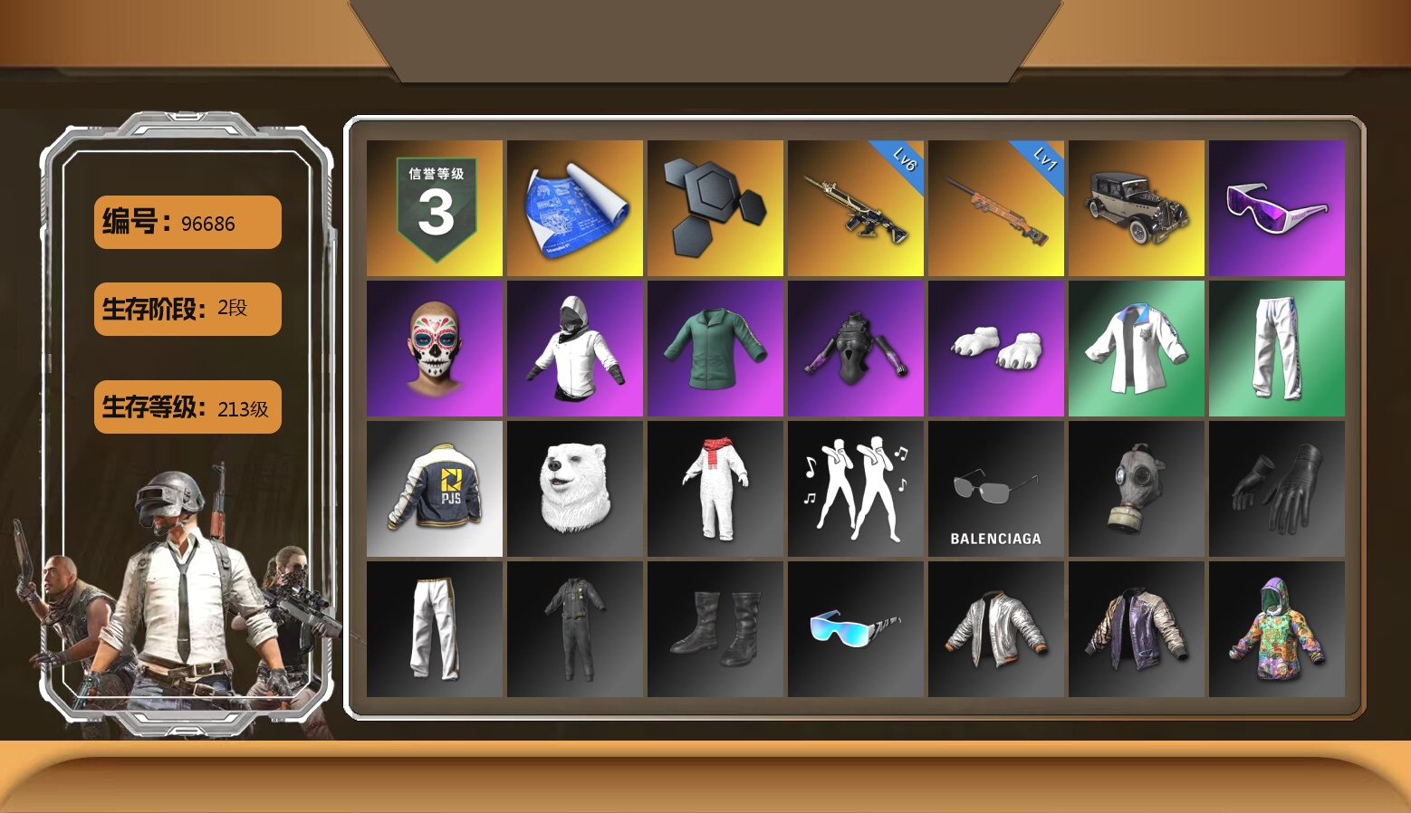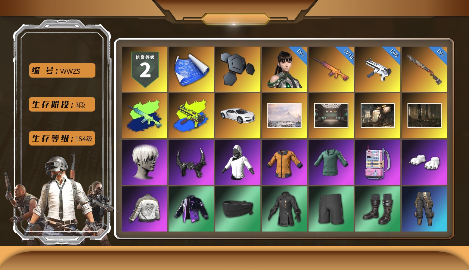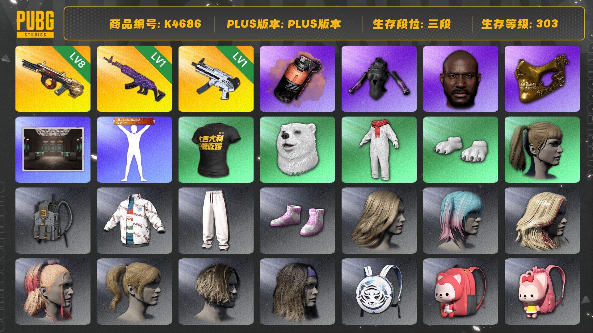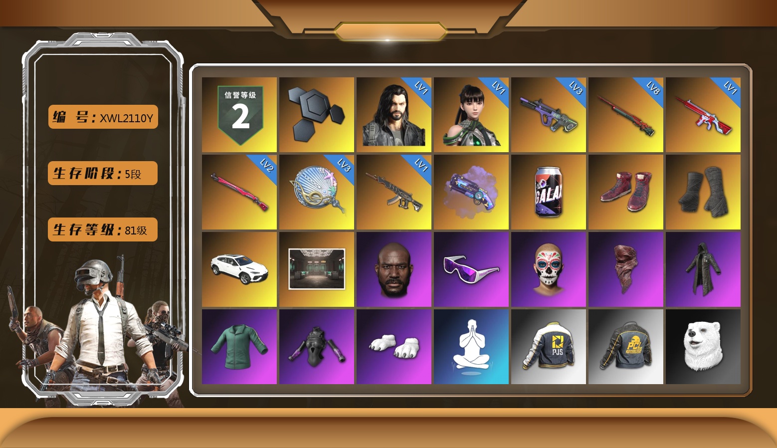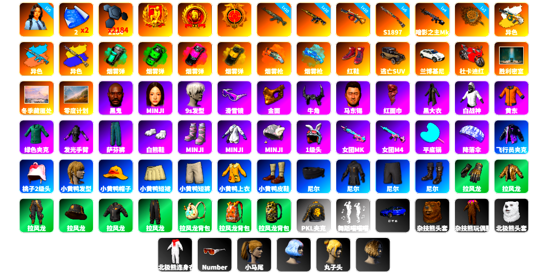 8级孙悟空M24 3级霓虹AUG 3级塞壬平底锅 2级午夜惊魂98K 1级多利安 1级伊芙 1级无信号M4 1级妖魔之触ACE 紫色魔法迷雾-M79 柏林鞋 黑绷带 兰博基尼SUV 交易所接待室 5814聚合物 黑鬼 滑雪镜 红面巾 黑大衣 活动绿东 发光手臂 白熊鞋 拉风龙 小马尾 脏辫 青海摇 小兔学院 绷带AK 西游记 PGC 2021套装