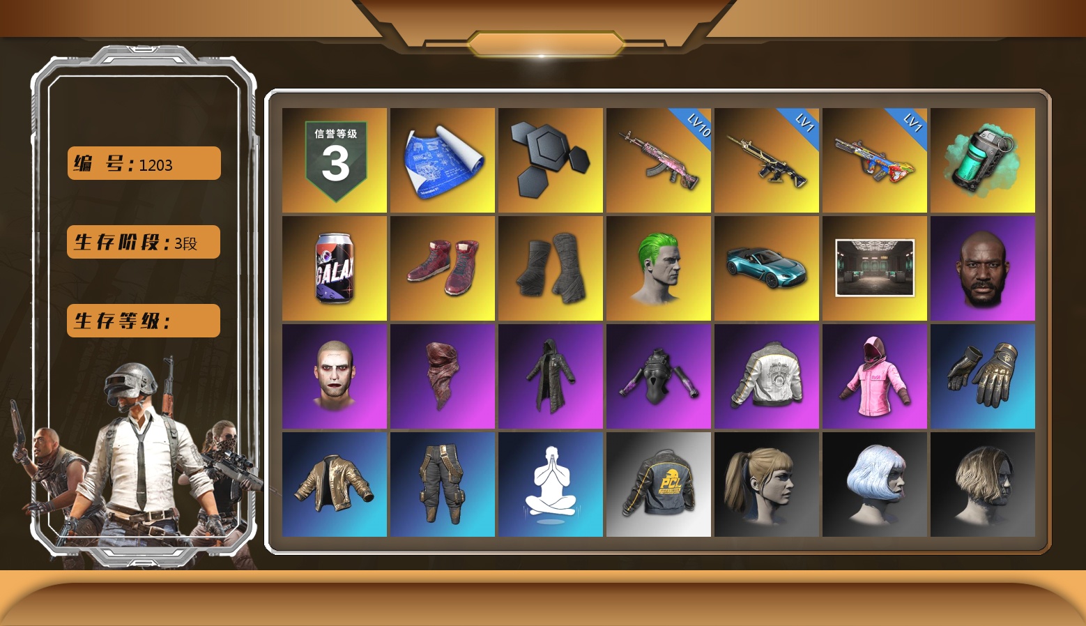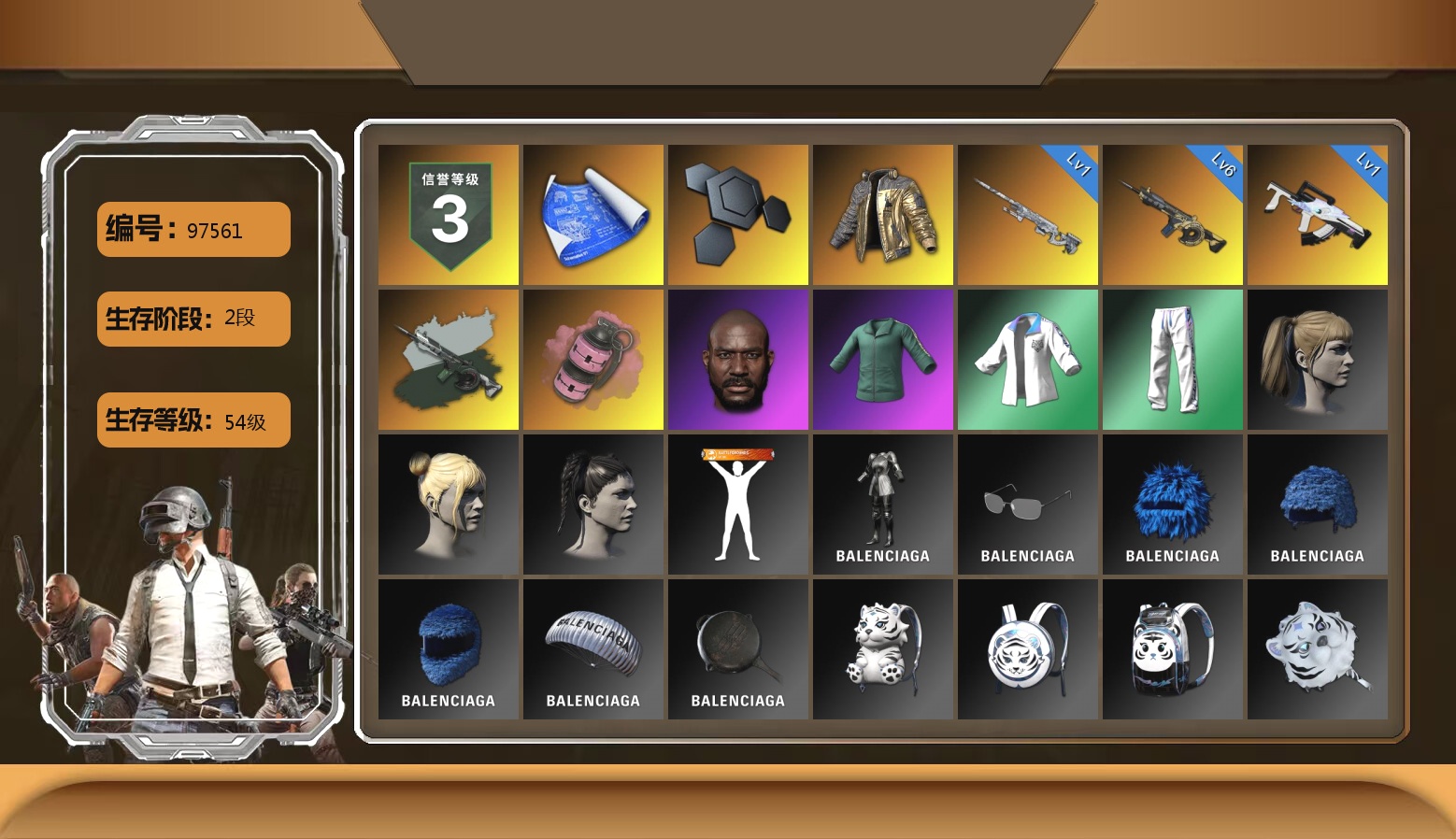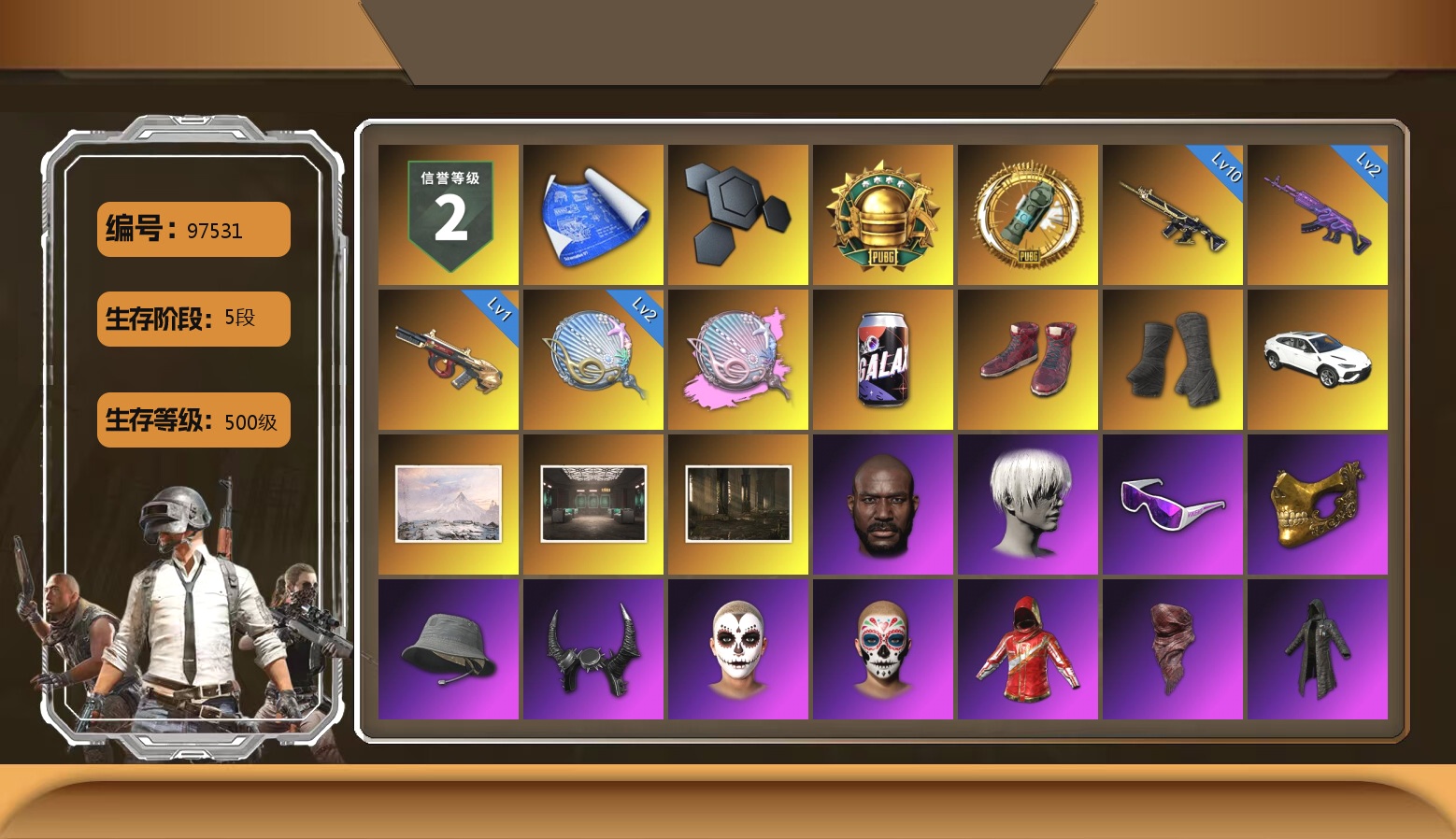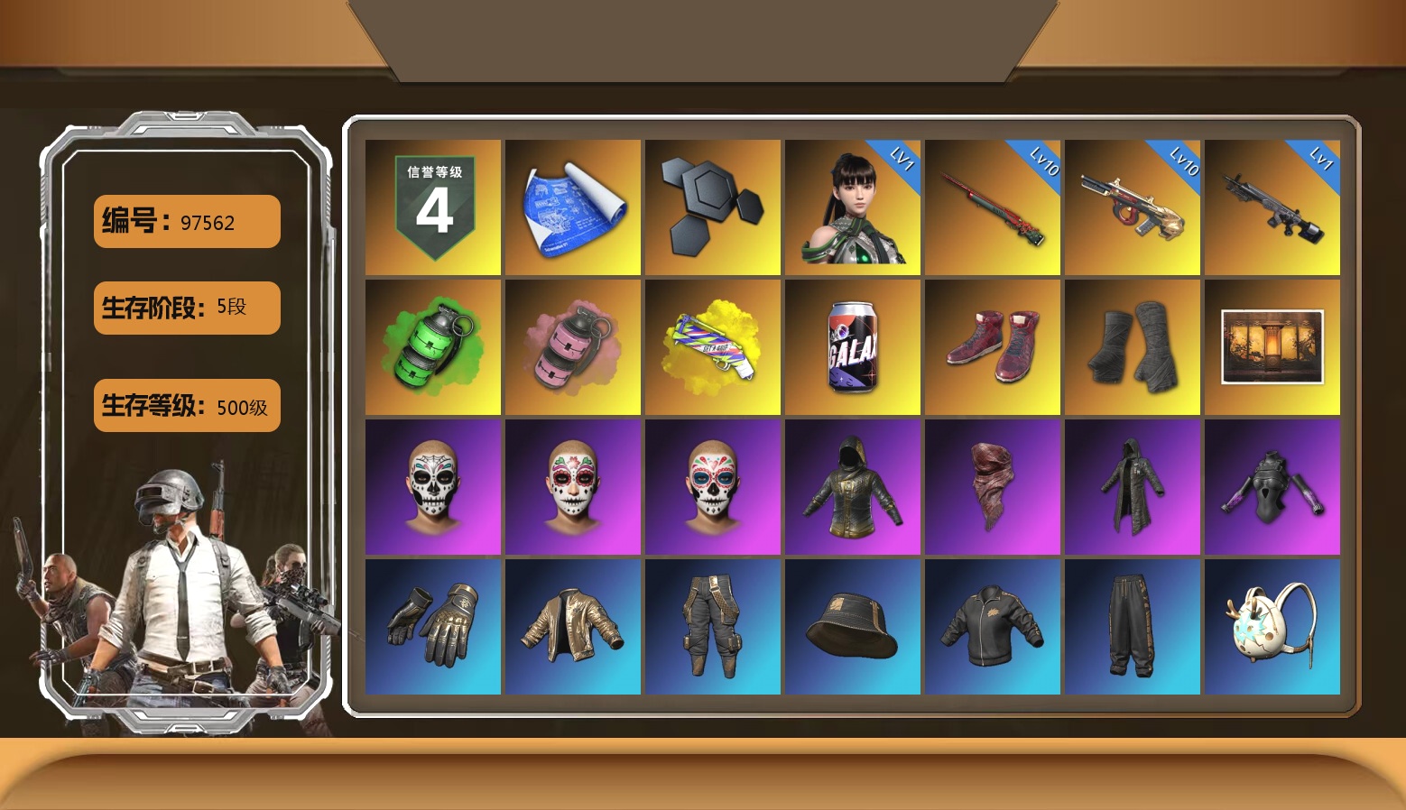 8级孙悟空M24 3级霓虹AUG 3级塞壬平底锅 2级午夜惊魂98K 1级多利安 1级伊芙 1级无信号M4 1级妖魔之触ACE 紫色魔法迷雾-M79 柏林鞋 黑绷带 兰博基尼SUV 交易所接待室 5814聚合物 黑鬼 滑雪镜 红面巾 黑大衣 活动绿东 发光手臂 白熊鞋 拉风龙 小马尾 脏辫 青海摇 小兔学院 绷带AK 西游记 PGC 2021套装