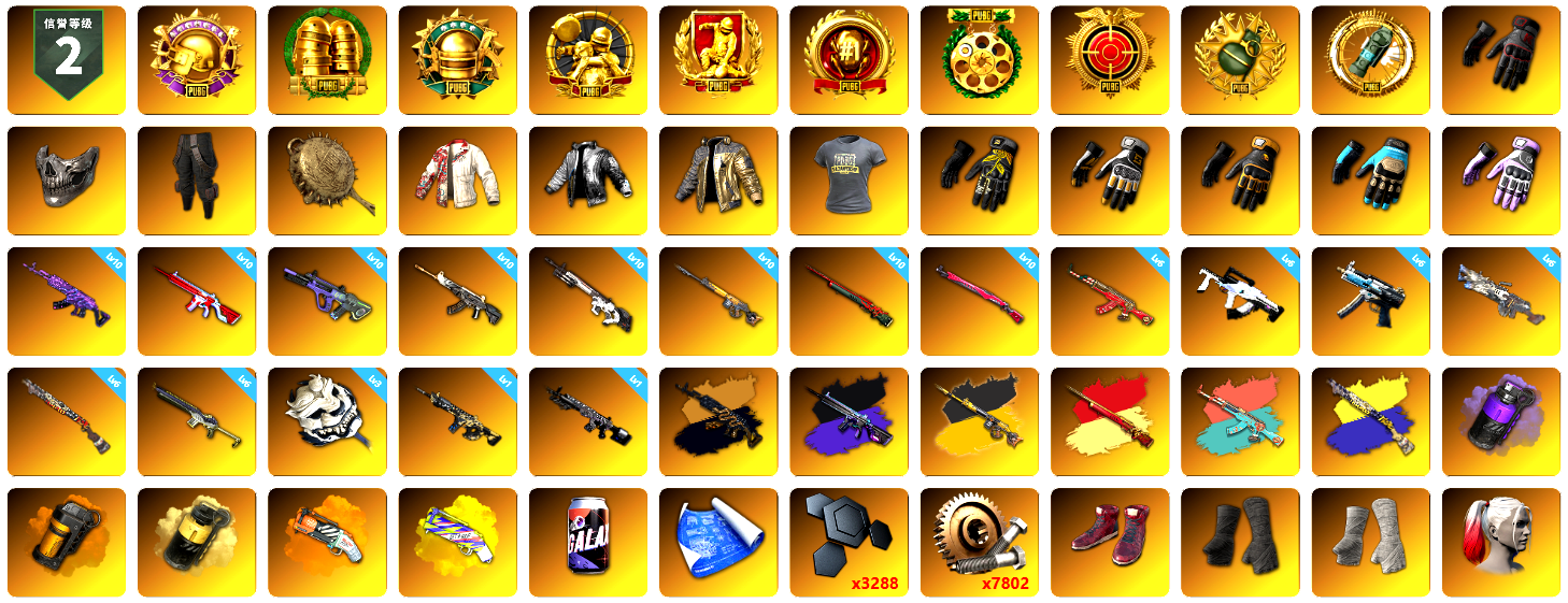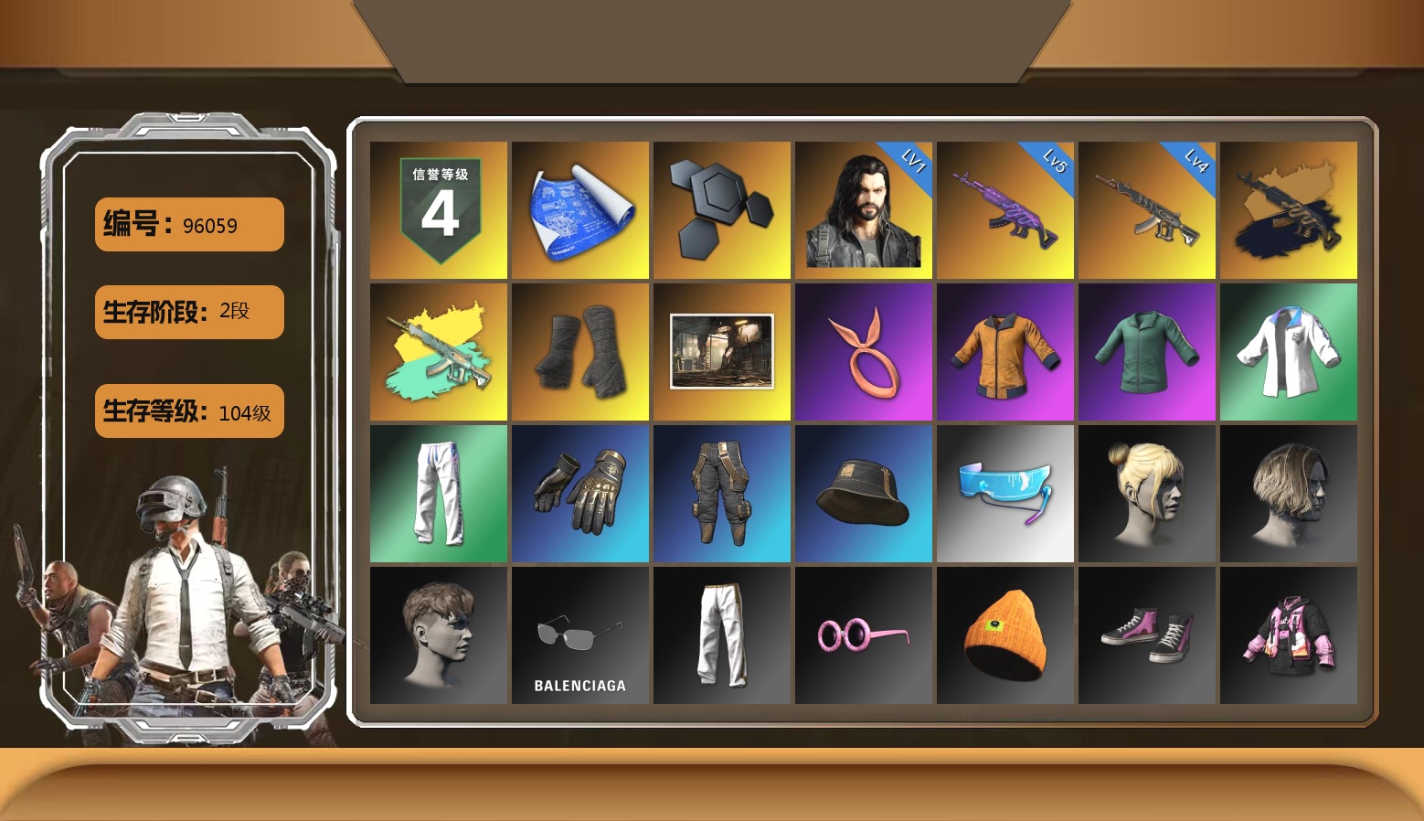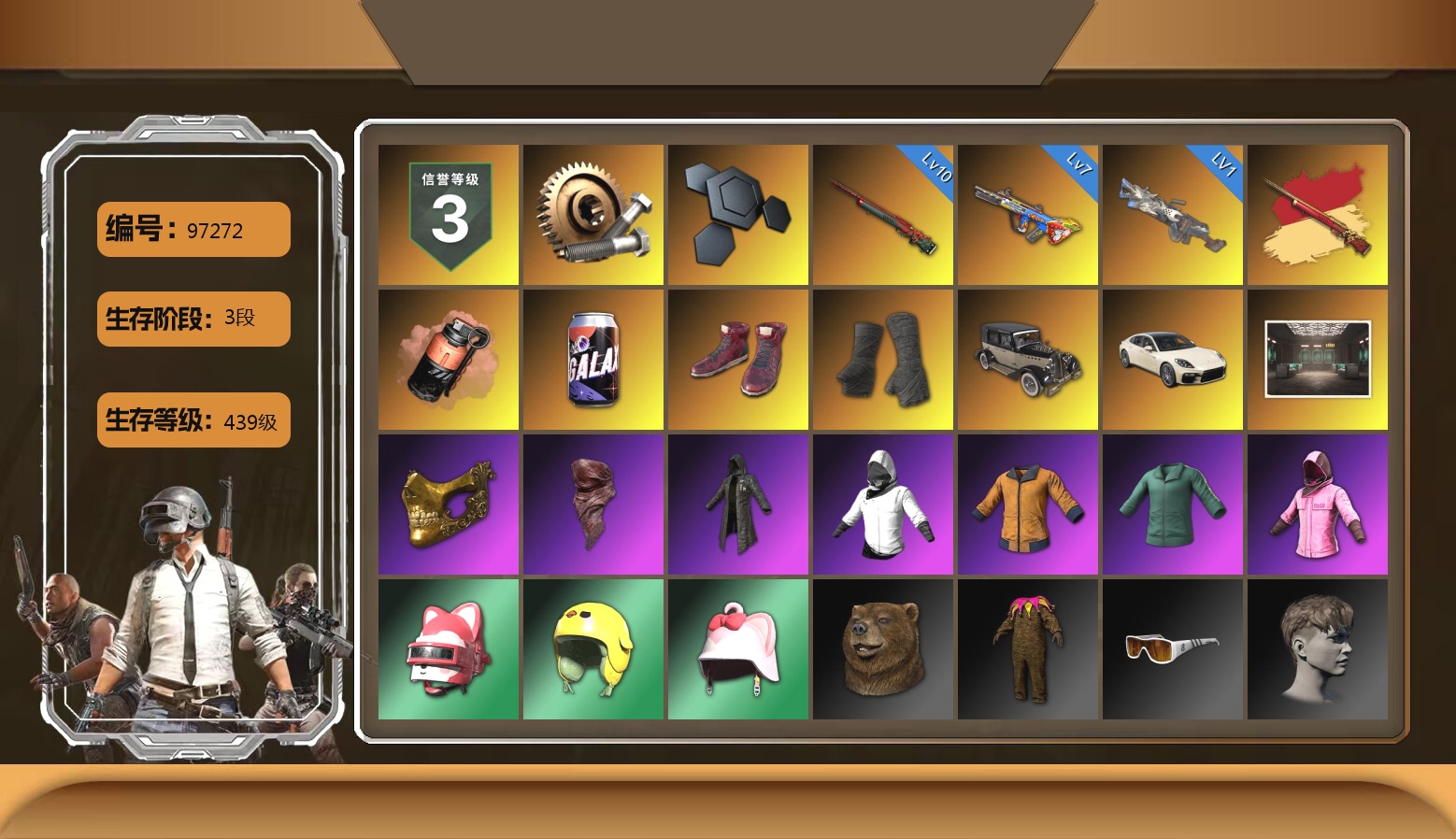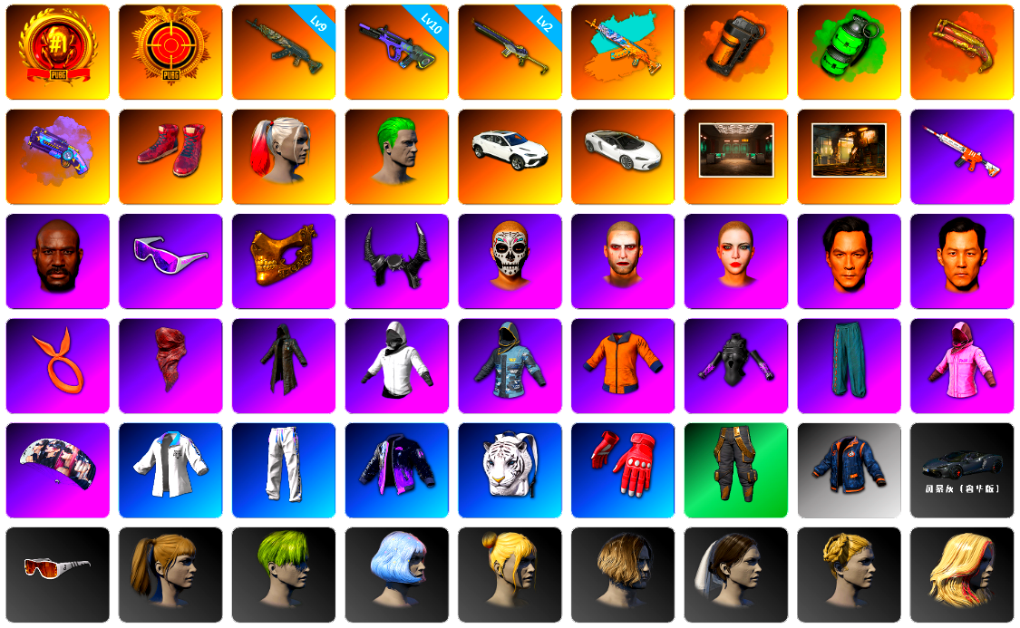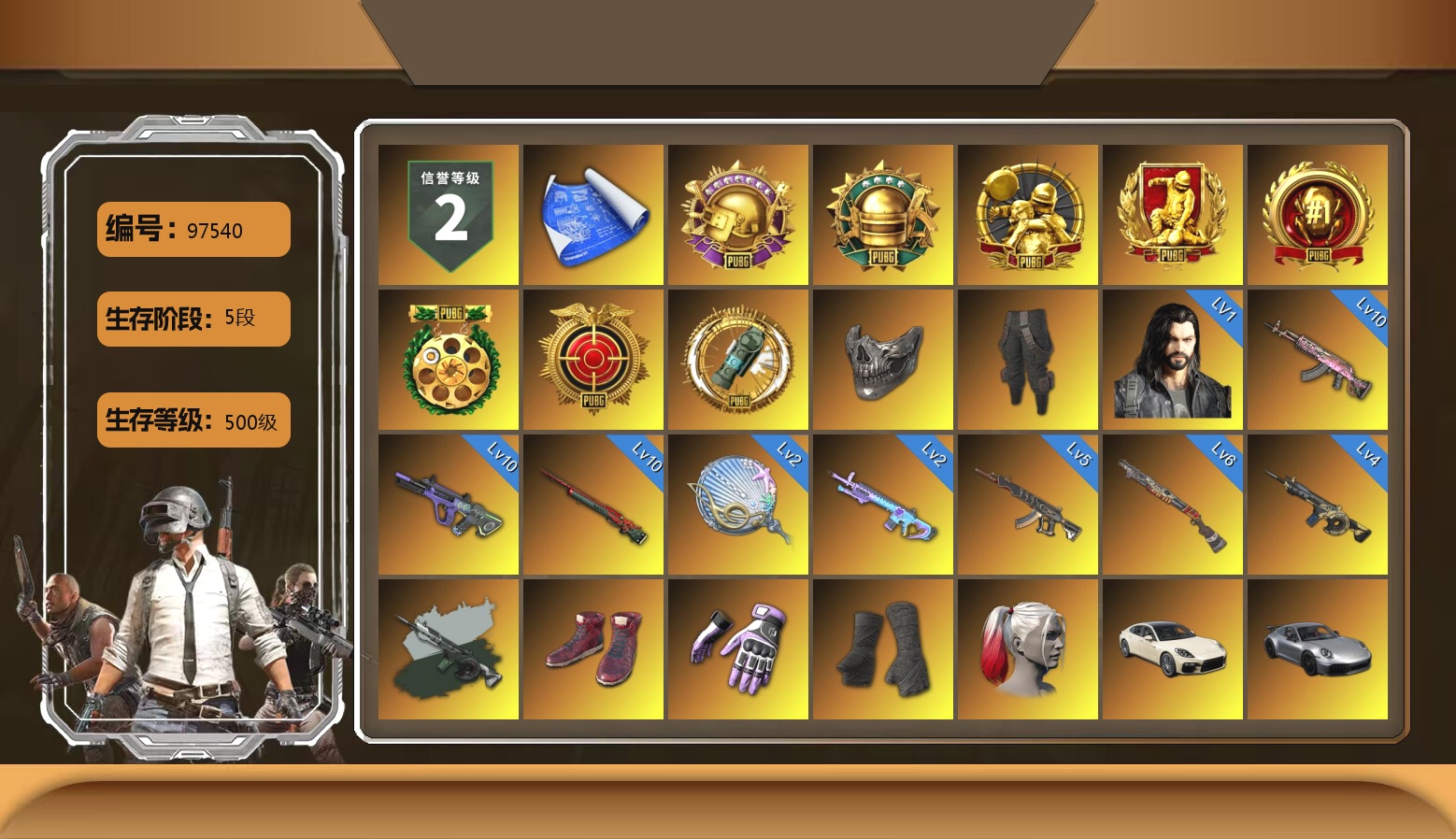 8级孙悟空M24 3级霓虹AUG 3级塞壬平底锅 2级午夜惊魂98K 1级多利安 1级伊芙 1级无信号M4 1级妖魔之触ACE 紫色魔法迷雾-M79 柏林鞋 黑绷带 兰博基尼SUV 交易所接待室 5814聚合物 黑鬼 滑雪镜 红面巾 黑大衣 活动绿东 发光手臂 白熊鞋 拉风龙 小马尾 脏辫 青海摇 小兔学院 绷带AK 西游记 PGC 2021套装