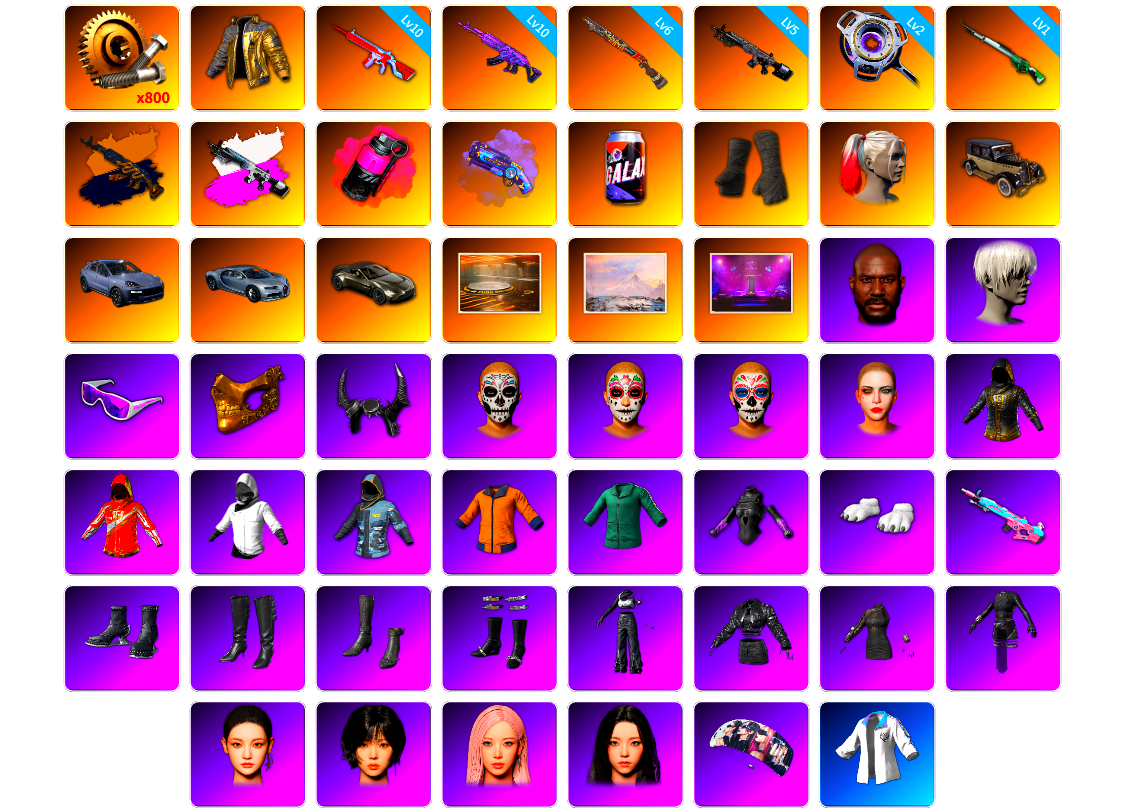 1级多利安 10级青龙762 10级孙悟空M24 8级赛博MK12 4级无信号M4 2级白虎锅 2级唐三藏平底锅 1级爆裂AUG 1级恶魔ACE 1级寒蚀MP5K 1级刻耳柏洛斯M249 1级德拉贡 1级烈日灼烧-S1897 青龙762(异色) 孙悟空M24(异色) 赛博MK12(异色) 唐三藏(异色) 青色烟雾弹 翡翠色烟雾弹 粉色烟雾弹 橙色狂怒之雾-M79 11张图纸 柏林鞋 黑绷带 兰博基尼SUV 兰博基尼奢华版 马丁敞篷跑车 马丁SUV 杜卡迪暮光粉 杜卡迪红 交易所接待室 武器神龛 黑鬼 滑雪镜 金面 马东锡 红面巾 黑大衣 白战神 黄东 发光手臂 萨芬裤 白熊鞋 粉战神 2024女团 阿狸 拉风龙 车漆 小马尾 丸子头 西游记 青海摇 小兔学院 悲喜 胜利之舞39